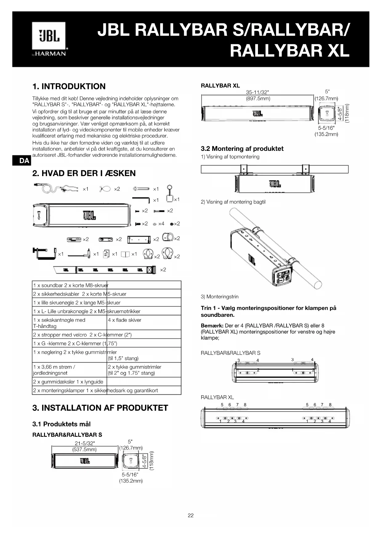 Tillykke med dit køb! Denne vejledning indeholder oplysninger om "RALLYBAR S"-, "RALLYBAR"- og "RALLYBAR XL"-højttalerne. Vi opfordrer dig til at bruge et par minutter på at læse denne vejledning, som beskriver generelle installationsvejledninger og brugsanvisninger. Vær venligst opmærksom på, at korrekt installation af lyd- og videokomponenter til mobile enheder kræver kvalificeret erfaring med mekaniske og elektriske procedurer. Hvis du ikke har den fornødne viden og værktøj til at udføre installationen, anbefaler vi på det kraftigste, at du konsulterer en autoriseret JBL-forhandler vedrørende installationsmulighederne.