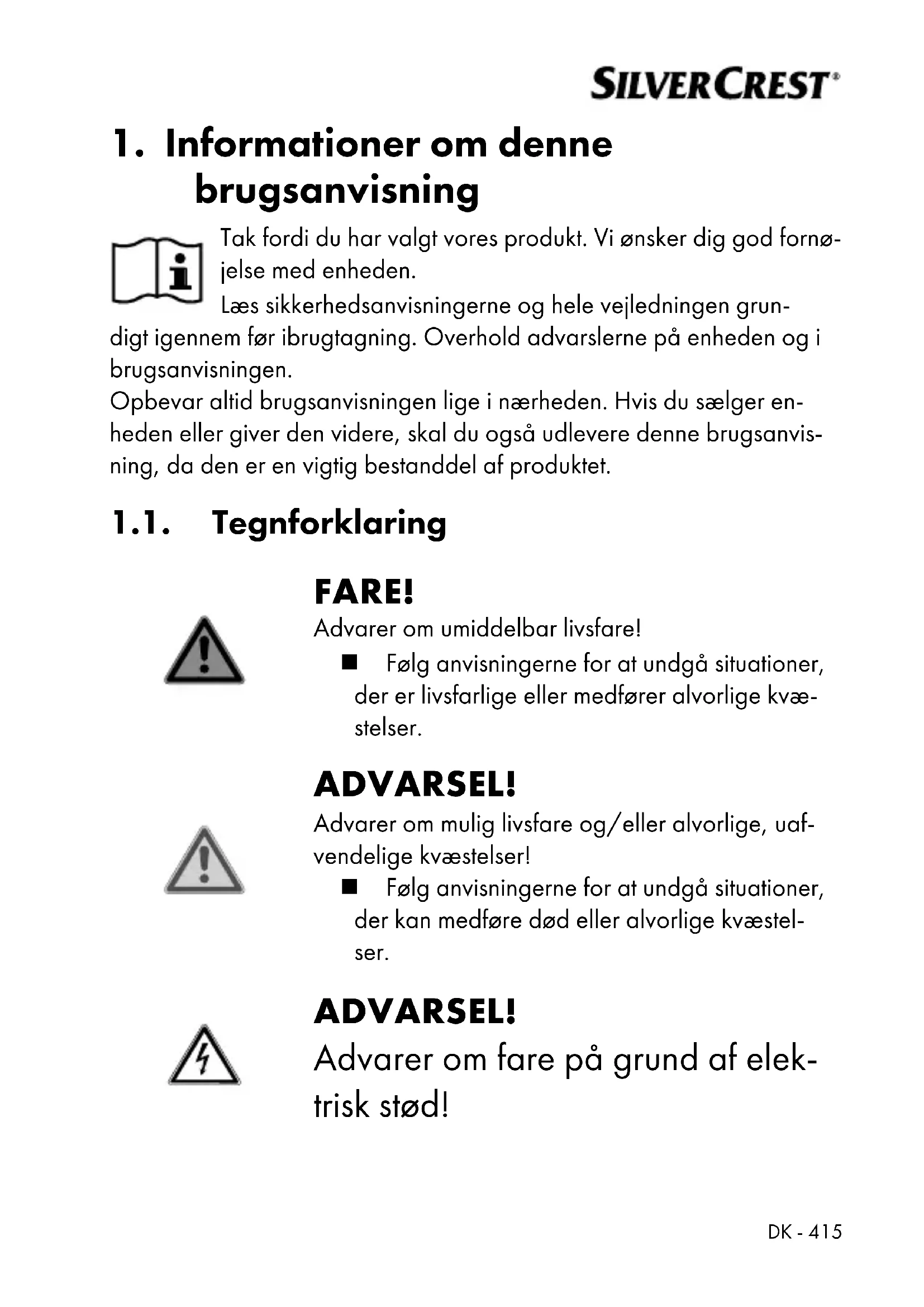Kontakt vores servicecenter, hvis du har tekniske problemer med din enhed. ADVARSEL! Fare for elektrisk stød! Der er fare for at få elektrisk stød på grund af strømførende dele. Åbn aldrig netadap- terens kabinet. Hvis netadapterens kabinet eller tilslut- ningsledningen er beskadiget, skal net- adapteren bortskaffes og erstattes med en ny netadapter af samme type.428 - DK