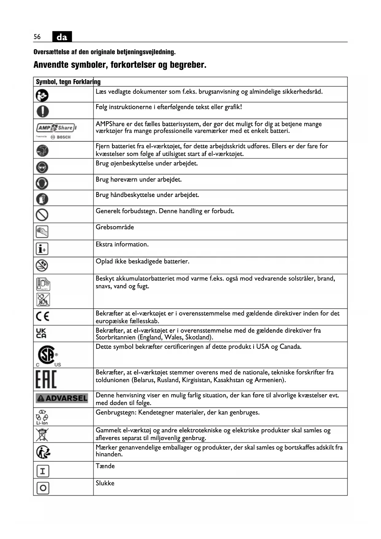 Oversættelse af den originale betjeningsvejledning. Anvendte symboler, forkortelser og begreber. Symbol, tegn Forklaring Læs vedlagte dokumenter som f.eks. brugsanvisning og almindelige sikkerhedsråd. Følg instruktionerne i efterfølgende tekst eller grafik! AMPShare er det fælles batterisystem, der gør det muligt for dig at betjene mange værktøjer fra mange professionelle varemærker med et enkelt batteri. Fjern batteriet fra el-værktøjet, før dette arbejdsskridt udføres. Ellers er der fare for kvæstelser som følge af utilsigtet start af el-værktøjet. Brug øjenbeskyttelse under arbejdet. Brug høreværn under arbejdet. Brug håndbeskyttelse under arbejdet. Generelt forbudstegn. Denne handling er forbudt. Grebsområde Ekstra information. Oplad ikke beskadigede batterier. Beskyt akkumulatorbatteriet mod varme f.eks. også mod vedvarende solstråler, brand, snavs, vand og fugt. Bekræfter at el-værktøjet er i overensstemmelse med gældende direktiver inden for det europæiske fællesskab. Bekræfter, at el-værktøjet er i overensstemmelse med de gældende direktiver fra Storbritannien (England, Wales, Skotland). Dette symbol bekræfter certificeringen af dette produkt i USA og Canada. Bekræfter, at el-værktøjet stemmer overens med de nationale, tekniske forskrifter fra toldunionen (Belarus, Rusland, Kirgisistan, Kasakhstan og Armenien). Denne henvisning viser en mulig farlig situation, der kan føre til alvorlige kvæstelser evt. med døden til følge. Genbrugstegn: Kendetegner materialer, der kan genbruges. Gammelt el-værktøj og andre elektrotekniske og elektriske produkter skal samles og afleveres separat til miljøvenlig genbrug. Mærker genanvendelige emballager og produkter, der skal samles og bortskaffes adskilt fra hinanden. Tænde Slukke max.50°C57