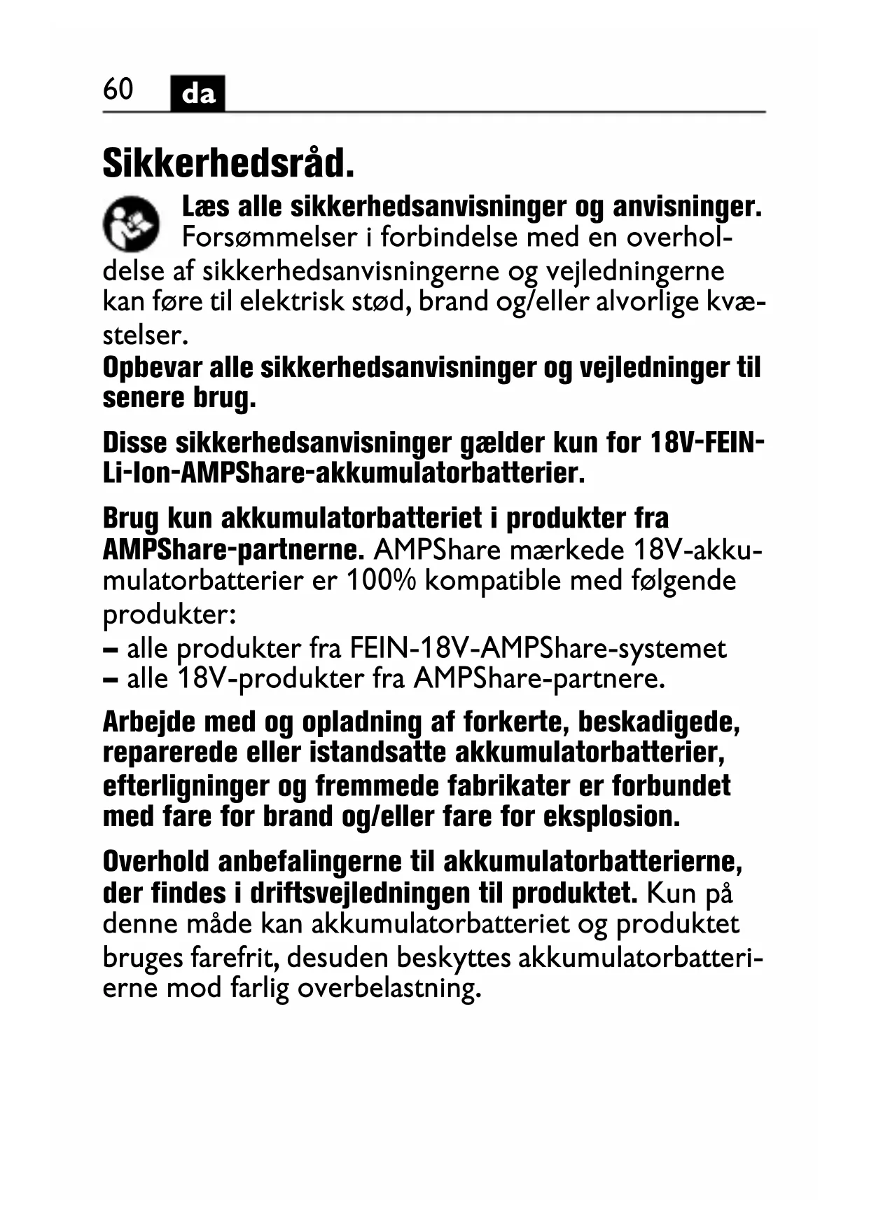 Sikkerhedsråd. Læs alle sikkerhedsanvisninger og anvisninger. Forsømmelser i forbindelse med en overhol- delse af sikkerhedsanvisningerne og vejledningerne kan føre til elektrisk stød, brand og/eller alvorlige kvæ- stelser. Opbevar alle sikkerhedsanvisninger og vejledninger til senere brug. Disse sikkerhedsanvisninger gælder kun for 18V-FEIN- Li-Ion-AMPShare-akkumulatorbatterier. Brug kun akkumulatorbatteriet i produkter fra AMPShare-partnerne. AMPShare mærkede 18V-akku- mulatorbatterier er 100% kompatible med følgende produkter: – alle produkter fra FEIN-18V-AMPShare-systemet – alle 18V-produkter fra AMPShare-partnere. Arbejde med og opladning af forkerte, beskadigede, reparerede eller istandsatte akkumulatorbatterier, efterligninger og fremmede fabrikater er forbundet med fare for brand og/eller fare for eksplosion. Overhold anbefalingerne til akkumulatorbatterierne, der findes i driftsvejledningen til produktet. Kun på denne måde kan akkumulatorbatteriet og produktet bruges farefrit, desuden beskyttes akkumulatorbatteri- erne mod farlig overbelastning.61