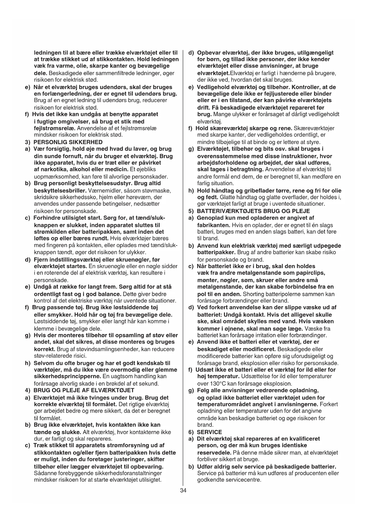 a) Dit elværktøj skal repareres af en kvaliceret person, og der må kun bruges identiske reservedele. På denne måde sikrer man, at elværktøjet forbliver sikkert at bruge. b) Udfør aldrig selv service på beskadigede batterier. Service på batterier må kun udføres af producenten eller godkendte servicecentre. ledningen til at bære eller trække elværktøjet eller til at trække stikket ud af stikkontakten. Hold ledningen væk fra varme, olie, skarpe kanter og bevægelige dele. Beskadigede eller sammenltrede ledninger, øger risikoen for elektrisk stød. e) Når et elværktøj bruges udendørs, skal der bruges en forlængerledning, der er egnet til udendørs brug. Brug af en egnet ledning til udendørs brug, reducerer risikoen for elektrisk stød. f) Hvis det ikke kan undgås at benytte apparatet i fugtige omgivelser, så brug et stik med fejlstrømsrelæ. Anvendelse af et fejlstrømsrelæ mindsker risikoen for elektrisk stød.