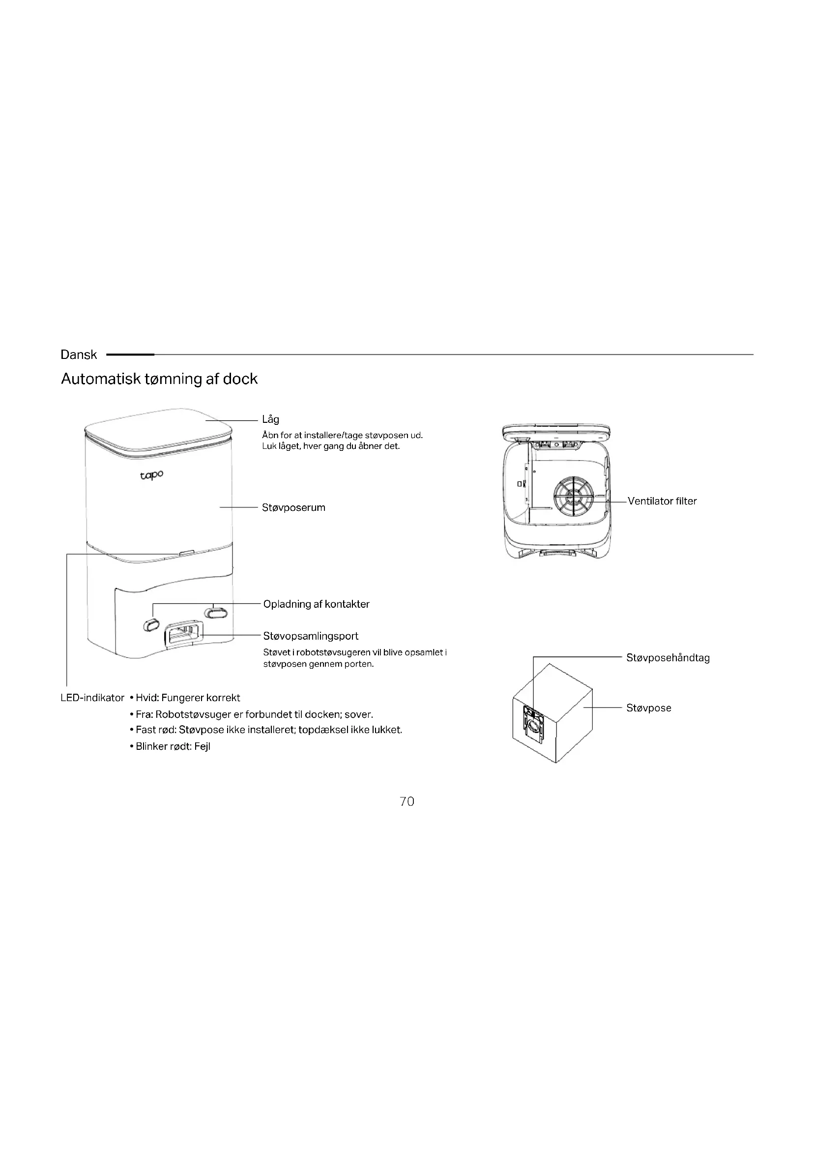 Knapper og lysdioder Opladnings- sensor Kofanger Dække over Opladnings- sensor Afbryderen Skraldespand Cli sensorer Sidebørste Hjul Svinghjul Opladning af kontakter Hovedbørste Hovedbørstedæksellås Filterlås Skraldespandslås Støvopsamlingsport Opladning af kontakter Støvopsamlingsport Filter Åbn skraldespanden Tapo RV30C Plus70 Dansk Automatisk tømning af dock LED-indikator Låg Støvposerum Opladning af kontakter Støvopsamlingsport Åbn for at installere/tage støvposen ud. Luk låget, hver gang du åbner det. Støvet i robotstøvsugeren vil blive opsamlet i støvposen gennem porten.