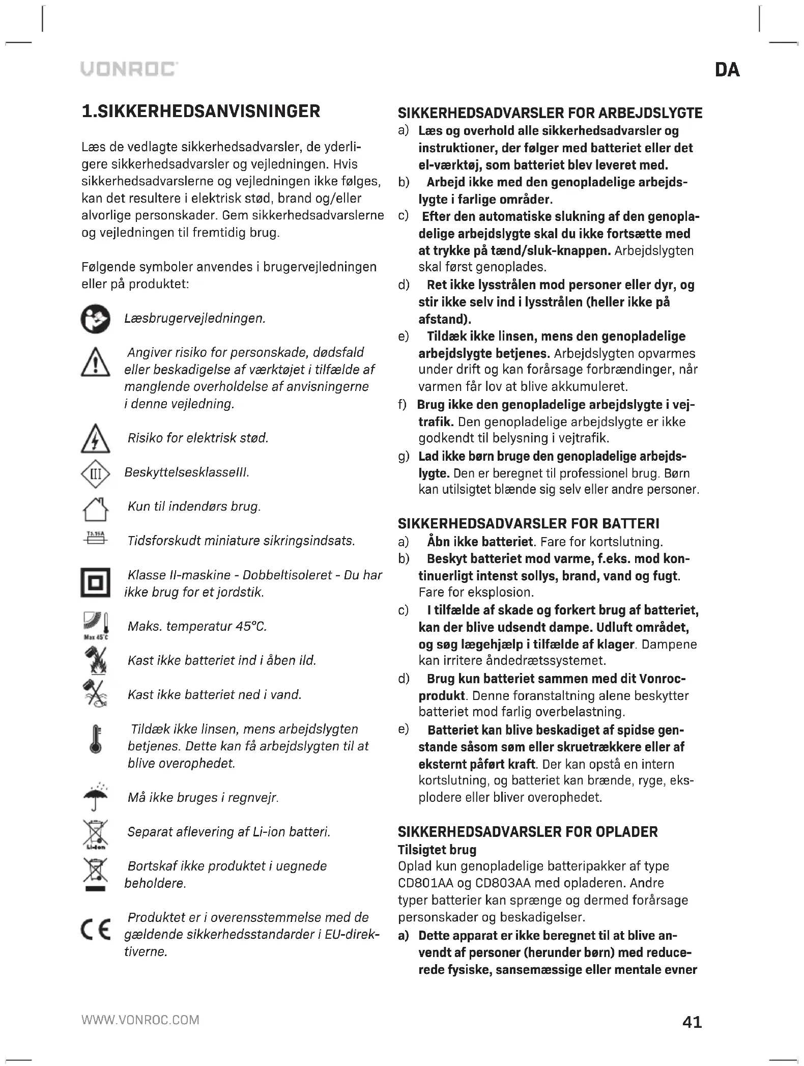 S_WL503DC CD801AA CD802AA S2_WL503DC 2 x CD801AA CD802AA S3_WL503DC CD803AA CD802AA Maskinoplysninger Spænding 20 VStrøm (I) 10 WStrøm (II) 20 WLysstrøm (I) 900 lmLysstrøm (II) 1800 lmFarvetemperatur 6500 KVægt 1,0kg Model nr. CD801AA Batteritype Lithium-IonSpænding 20 VKapacitet 2,0 AhAnbefalet oplader CD802AAVægt 0,3kg Model nr. CD802AA Opladerinput 220-240 V, 50 Hz 0,4 AOpladeroutput 21 V 2,5 AOpladningstid 2 Ah batteri 60 minutterOpladningstid 4 Ah batteri 120 minutterAnbefalede batterier CD801AA, CD803AAVægt 0,36kg Model nr. CD803AA Batteritype Lithium-IonSpænding 20 V Kapacitet 4,0 AhAnbefalet oplader CD802AAVægt 0,65kg Brug kun de følgende batterier af VONROC VPOWER 20V-batteriplatformen. Brug af andre batterier kan for- årsage personskade eller beskadigelse af værktøjet. CD801AA 20 V, 2 Ah Lithium-Ion CD803AA 20 V, 4 Ah Lithium-Ion Den følgende oplader kan bruges til at oplade disse batterier. CD802AA Hurtig oplader Batterierne af VONROC VPOWER 20V-batteriplatfor- men kan udskiftes med alle værktøjer af VONROC VPOWER 20V-batteriplatformen. BESKRIVELSE Tallene iteksten henviser til diagrammerne på side2-3.