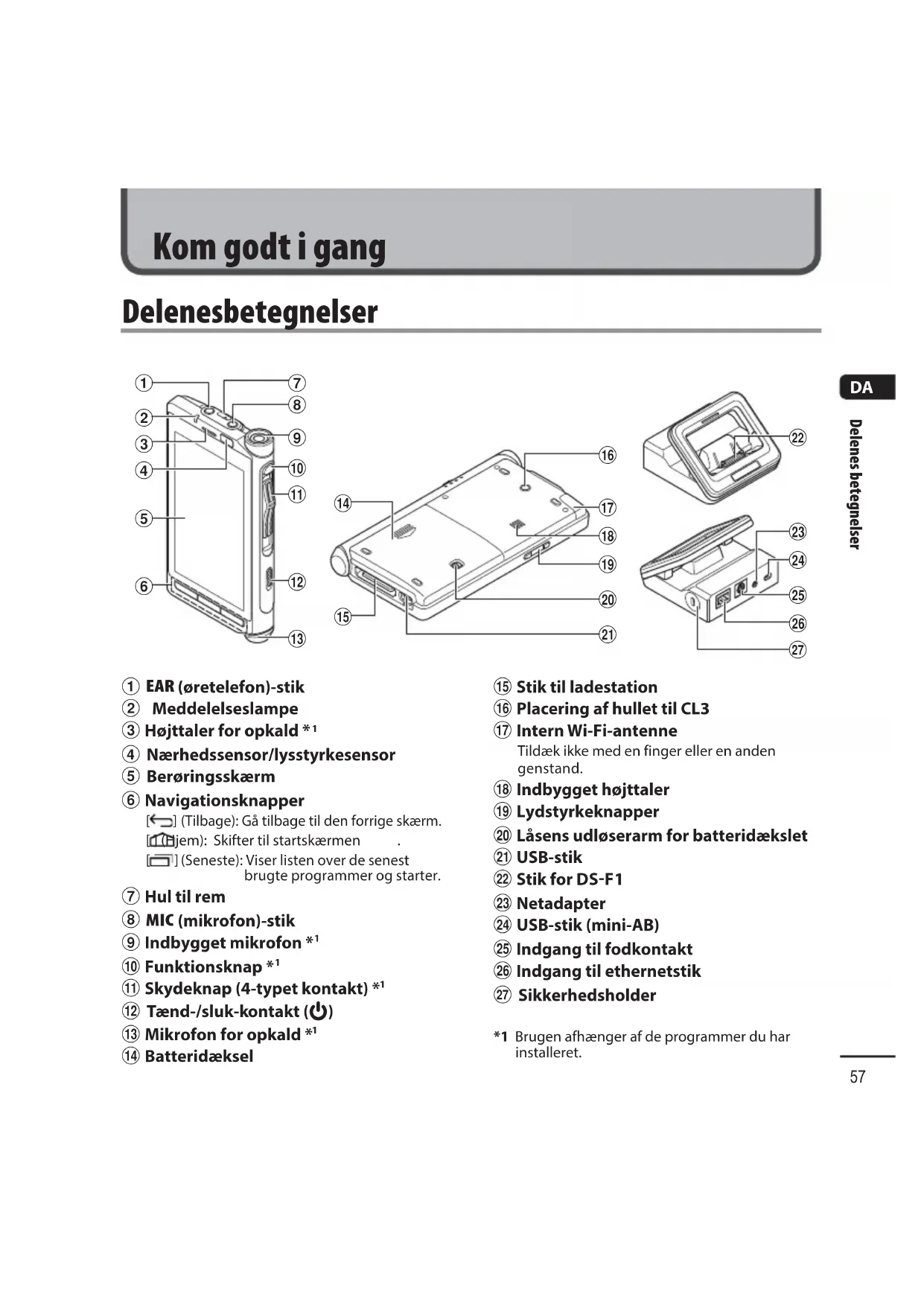 Delenes betegnelser Berøringsskærm 4 Startskærm 1 Statuslinje Angiver resterende batterikapacitet, enhedsindstillinger, meddelelser og andre oplysninger, vises med et med ikon. ]: Wi-Fi ]: Flytilstand ]: Lydløs ]: Alarm ]: Batteriindikator ]: Batteriopladning 2 Visning af tid 3 Knappen