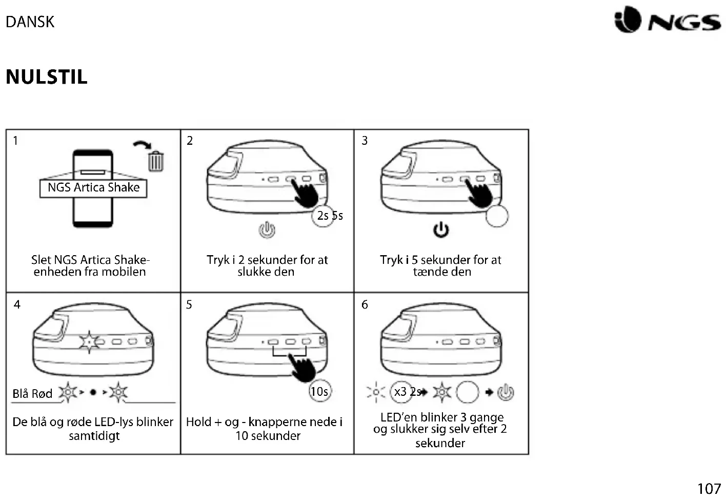 Blå Rød De blå og røde LED-lys blinker samtidigt Slet NGS Artica Shake- enheden fra mobilen Hold + og - knapperne nede i 10 sekunder LED’en blinker 3 gange og slukker sig selv efter 2 sekunder Tryk i 5 sekunder for at tænde den Tryk i 2 sekunder for at slukke den 10s x3 2s 2s 5sBRUGERVEJLEDNING