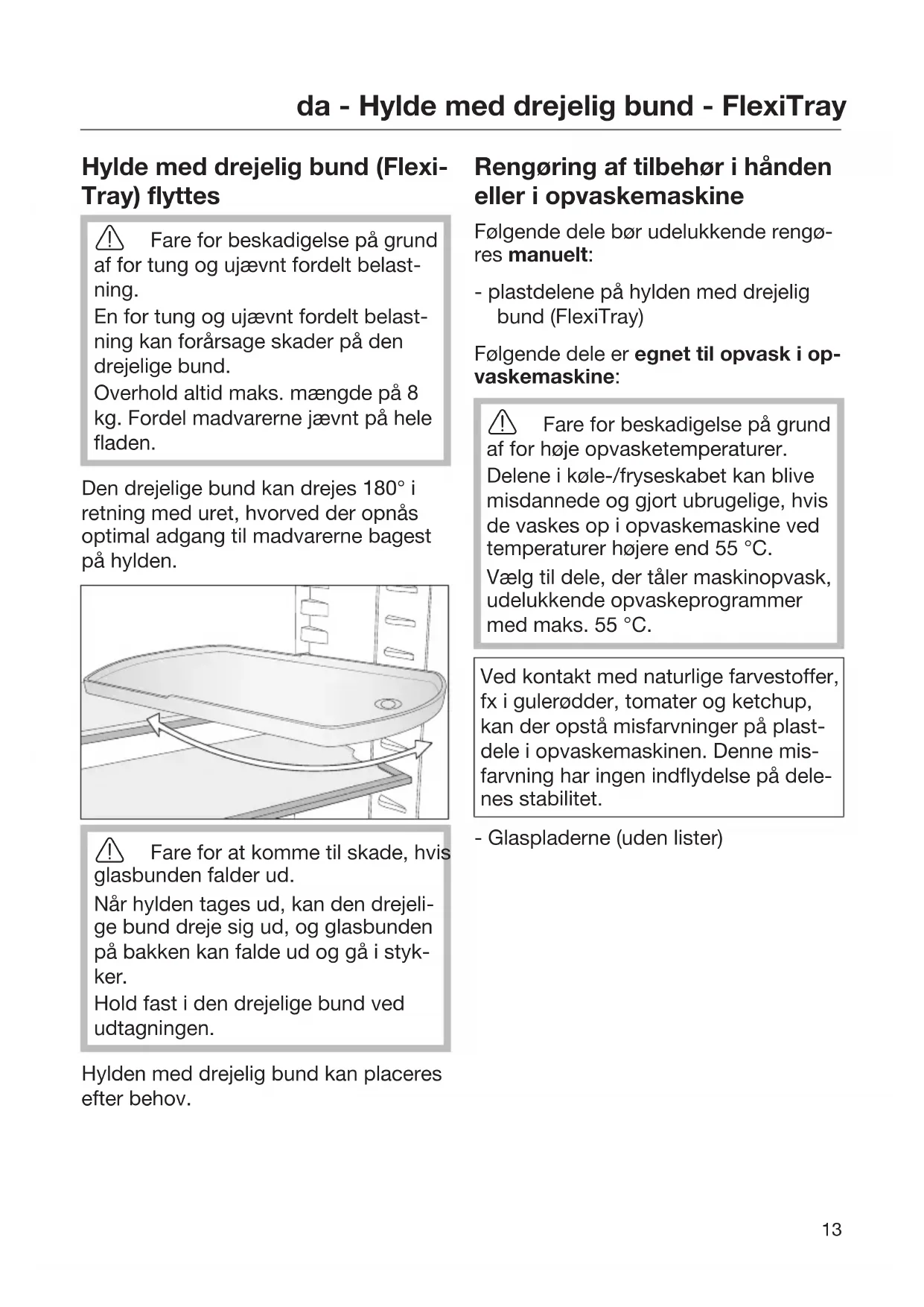 Hylde med drejelig bund (Flexi- Tray) flyttes Fare for beskadigelse på grund af for tung og ujævnt fordelt belast- ning. En for tung og ujævnt fordelt belast- ning kan forårsage skader på den drejelige bund. Overhold altid maks. mængde på 8 kg. Fordel madvarerne jævnt på hele fladen. Den drejelige bund kan drejes 180° i retning med uret, hvorved der opnås optimal adgang til madvarerne bagest på hylden. Fare for at komme til skade, hvis glasbunden falder ud. Når hylden tages ud, kan den drejeli- ge bund dreje sig ud, og glasbunden på bakken kan falde ud og gå i styk- ker. Hold fast i den drejelige bund ved udtagningen. Hylden med drejelig bund kan placeres efter behov. Rengøring af tilbehør i hånden eller i opvaskemaskine Følgende dele bør udelukkende rengø- res manuelt: - plastdelene på hylden med drejelig bund (FlexiTray) Følgende dele er egnet til opvask i op- vaskemaskine: Fare for beskadigelse på grund af for høje opvasketemperaturer. Delene i køle-/fryseskabet kan blive misdannede og gjort ubrugelige, hvis de vaskes op i opvaskemaskine ved temperaturer højere end 55 °C. Vælg til dele, der tåler maskinopvask, udelukkende opvaskeprogrammer med maks. 55 °C. Ved kontakt med naturlige farvestoffer, fx i gulerødder, tomater og ketchup, kan der opstå misfarvninger på plast- dele i opvaskemaskinen. Denne mis- farvning har ingen indflydelse på dele- nes stabilitet. - Glaspladerne (uden lister)da - Hylde med drejelig bund - FlexiTray