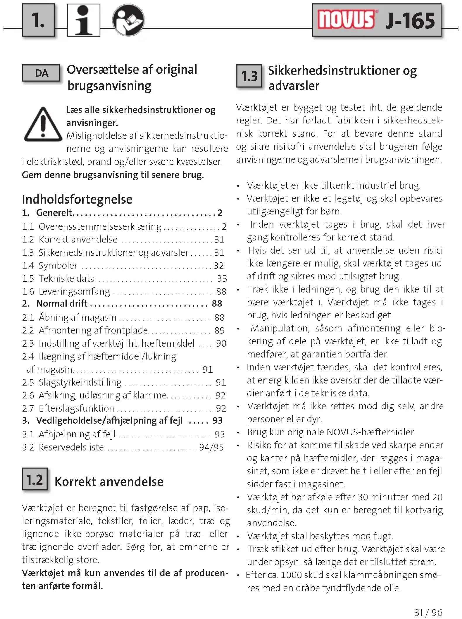 Sikkerhedsinstruktioner og advarsler Værktøjet er bygget og testet iht. de gældende regler. Det har forladt fabrikken i sikkerhedstek-nisk korrekt stand. For at bevare denne stand og sikre risikofri anvendelse skal brugeren følge anvisningerne og advarslerne i brugsanvisningen.• Værktøjet er ikke tiltænkt industriel brug.• Værktøjet er ikke et legetøj og skal opbevares utilgængeligt for børn.• Inden værktøjet tages i brug, skal det hver gang kontrolleres for korrekt stand. • Hvis det ser ud til, at anvendelse uden risici ikke længere er mulig, skal værktøjet tages ud af drift og sikres mod utilsigtet brug.• Træk ikke i ledningen, og brug den ikke til at bære værktøjet i. Værktøjet må ikke tages i brug, hvis ledningen er beskadiget.• Manipulation, såsom afmontering eller blo-kering af dele på værktøjet, er ikke tilladt og medfører, at garantien bortfalder.• Inden værktøjet tændes, skal det kontrolleres, at energikilden ikke overskrider de tilladte vær-dier anført i de tekniske data.• Værktøjet må ikke rettes mod dig selv, andre personer eller dyr.• Brug kun originale NOVUS-hæftemidler. • Risiko for at komme til skade ved skarpe ender og kanter på hæftemidler, der lægges i maga-sinet, som ikke er drevet helt i eller efter en fejl sidder fast i magasinet.• Værktøjet bør afkøle efter minutter med skud/min, da det kun er beregnet til kortvarig anvendelse.• Værktøjet skal beskyttes mod fugt.• Træk stikket ud efter brug. Værktøjet skal være under opsyn, så længe det er tilsluttet strøm.• Efter ca. skud skal klammeåbningen smø-res med en dråbe tyndtflydende olie.32 / 96