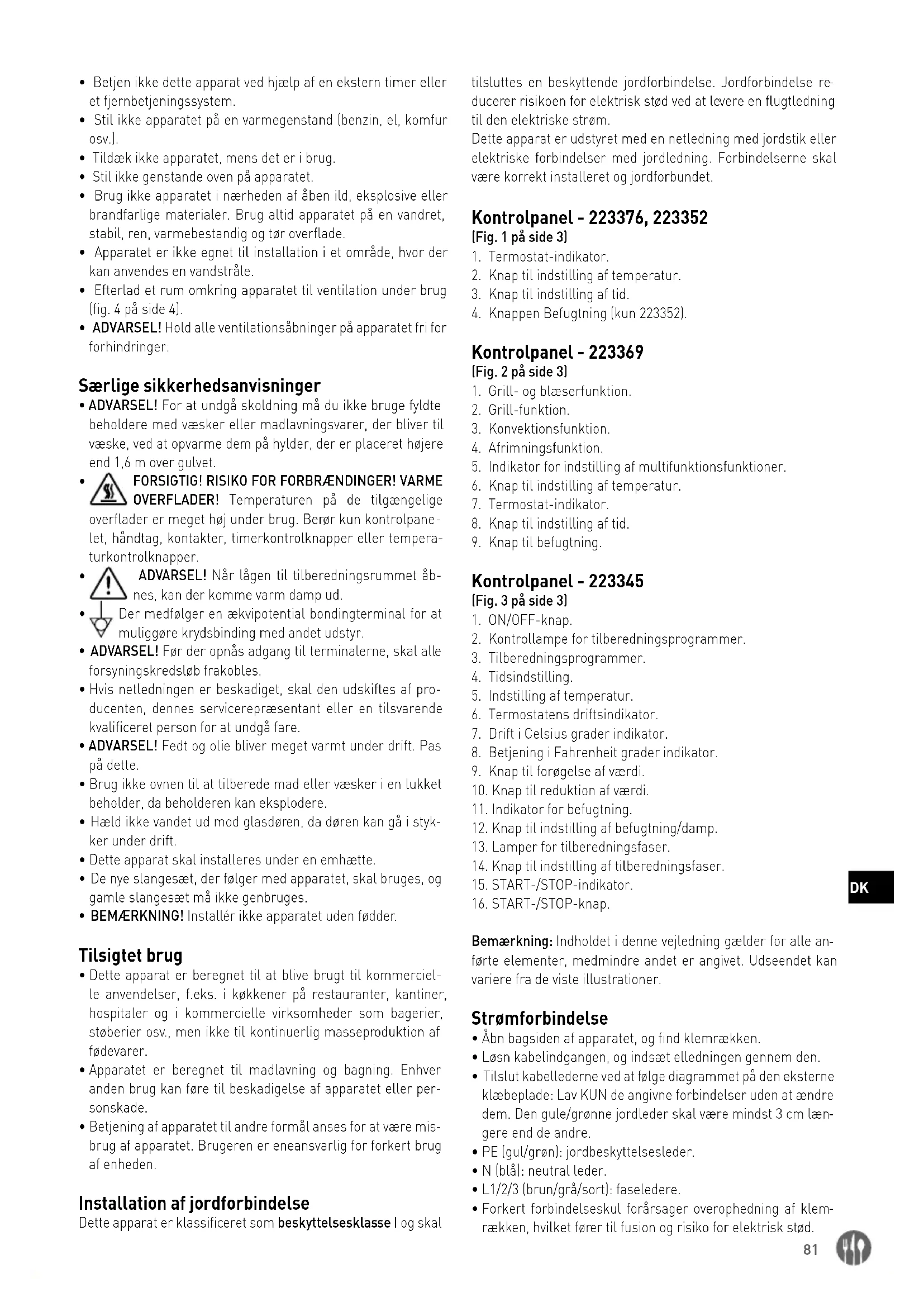 sende en let lugt under de første få anvendelser. Dette er nor- malt og angiver ikke nogen defekt eller fare. Sørg for, at appa- ratet er godt ventileret. Betjeningsvejledning Elektromekanisk styring (223376, 223352, 223369)