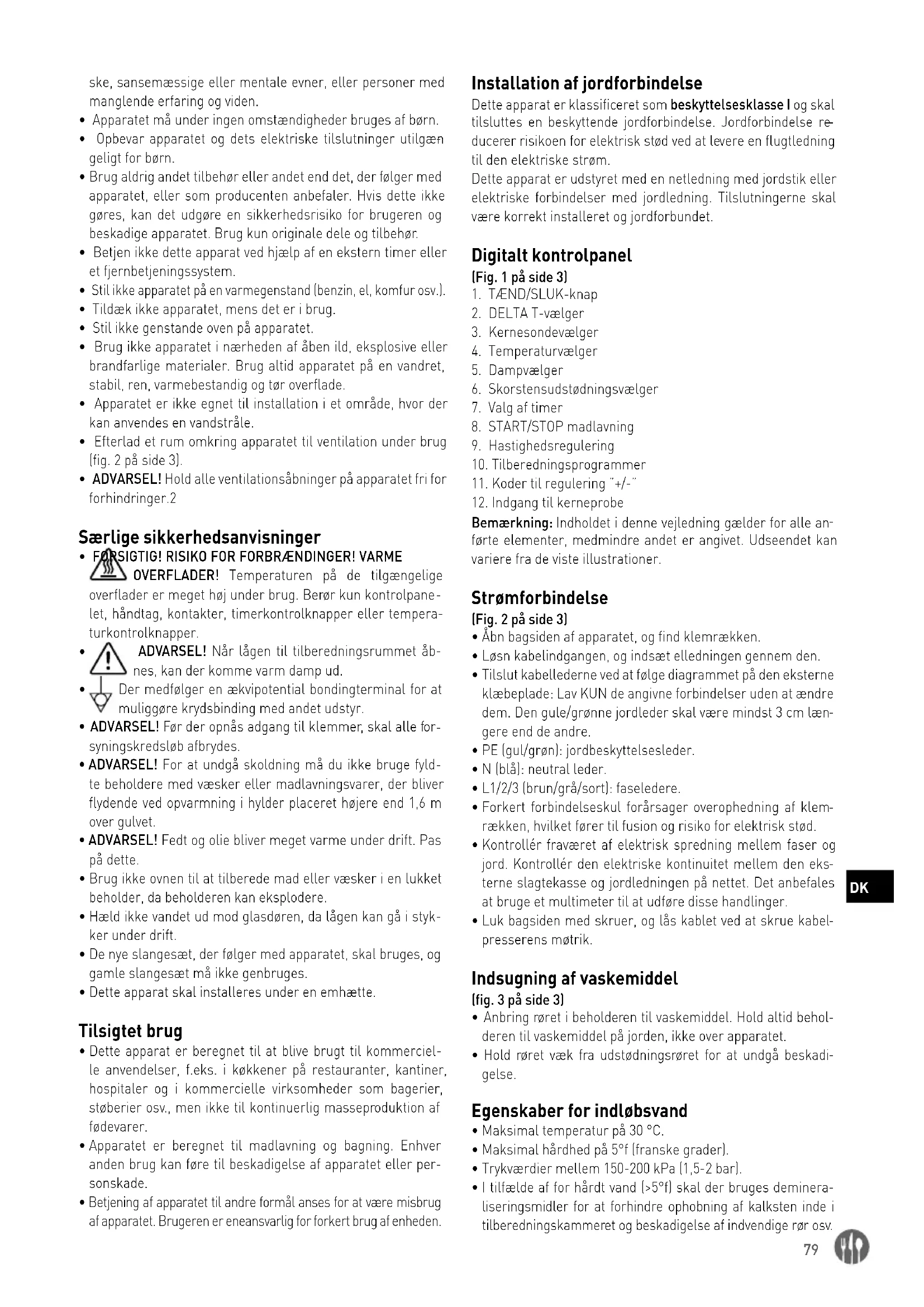 ducerer risikoen for elektrisk stød ved at levere en flugtledning til den elektriske strøm. Dette apparat er udstyret med en netledning med jordstik eller elektriske forbindelser med jordledning. Tilslutningerne skal være korrekt installeret og jordforbundet. Digitalt kontrolpanel (Fig. 1 på side 3)
