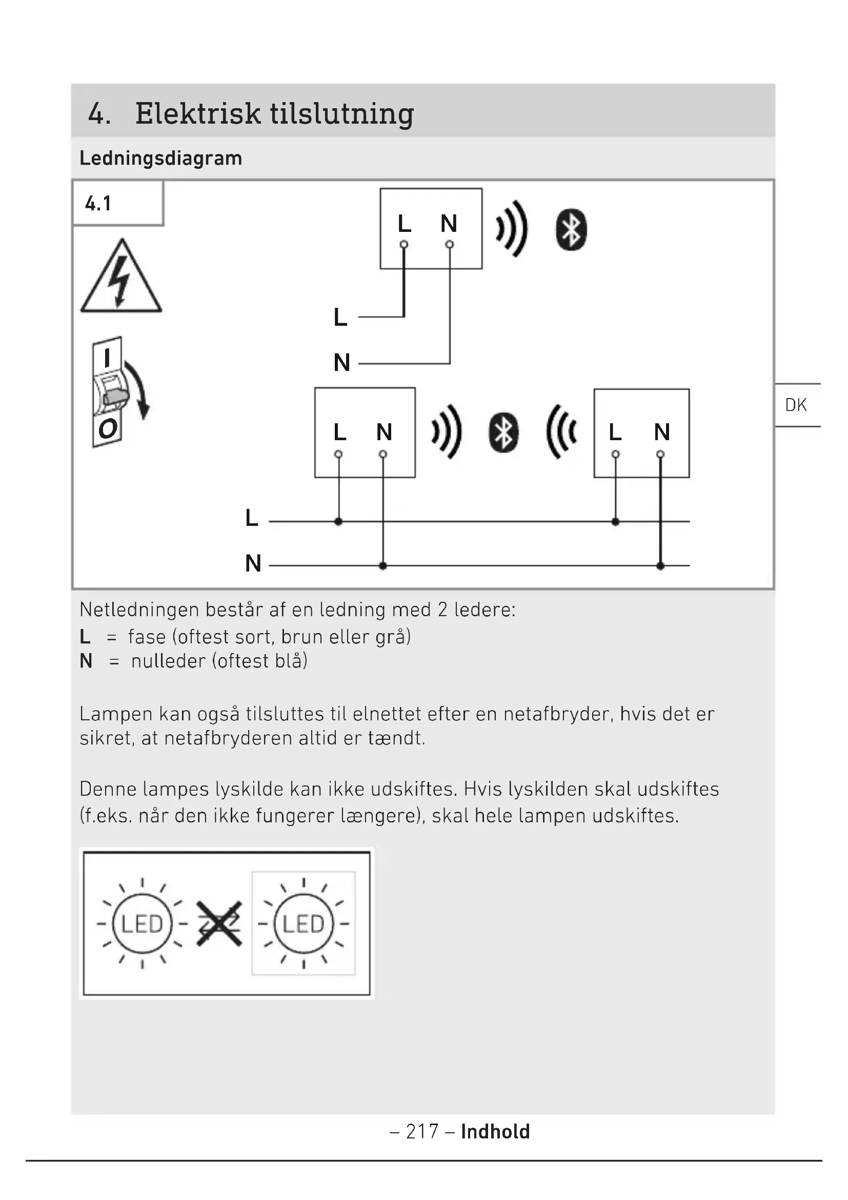L N Netledningen består af en ledning med 2 ledere: L = fase (oftest sort, brun eller grå) N = nulleder (oftest blå) Lampen kan også tilsluttes til elnettet efter en netafbryder, hvis det er sikret, at netafbryderen altid er tændt. Denne lampes lyskilde kan ikke udskiftes. Hvis lyskilden skal udskiftes (f.eks. når den ikke fungerer længere), skal hele lampen udskiftes.– 218 – Indhold