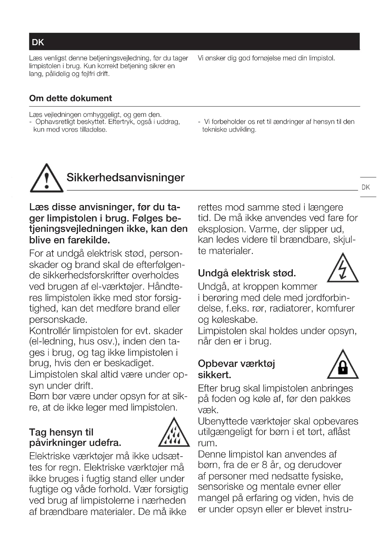 DK- 56 - eret i sikker brug af limpistolen og forstår faren i forbindelse med brug af limpistolen. Børn må ikke lege med limpistolen. Rengøring og brugervedligeholdelse må kun udføres af børn, hvis de er under opsyn. Værktøjerne må ikke overbelastes. De arbejder optimalt og sikkert inden for det anførte effektområde. Bær ik- ke værktøjet i ledningen, og brug ikke ledningen til at trække stikket ud af stikkontakten. Beskyt ledningen mod varme, olie og skarpe kanter. Vær opmærksom på giftige gasser og antændelsesfare. Ved bearbejdning af plast, maling og lignende materialer kan der opstå gif- tige gasser. Vær opmærksom på brand- og an- tændelsesfare. Af hensyn til din egen sikkerhed bør du kun anvende tilbehør og ekstra- udstyr, der er anført i betjeningsvej- ledningen eller anbefales/oplyses af værktøjsproducenten. Anvendes andet tilbehør og udstyr end angivet i betjeningsvejledningen eller kataloget, kan dette medføre personskade. Reparationer må kun udføres af en elektriker. Dette elektriske værktøj overholder de gældende sikkerhedsforskrifter. Reparation må kun udføres af en elektriker, ellers kan brugeren komme til skade. Hvis limpistolens el-ledning beskadiges, skal den udskiftes af producenten eller en anden kvalifice- ret person for at undgå farlige situa- tioner. Opbevar sikkerhedsanvisningerne sammen med limpistolen. Sikkerhedsanvisninger- 56 - - 57 -