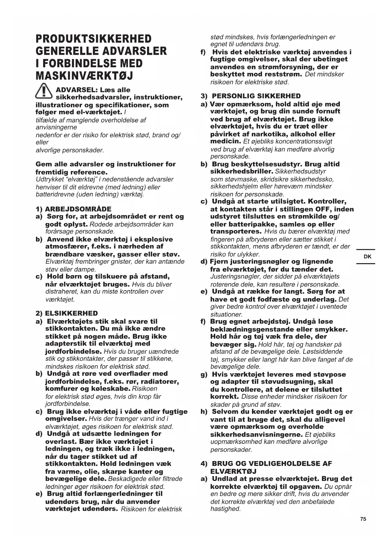 a) Sørg for, at arbejdsområdet er rent og godt oplyst. Rodede arbejdsområder kan forårsage personskade. b) Anvend ikke elværktøj i eksplosive atmosfærer, f.eks. i nærheden af brændbare væsker, gasser eller støv. Elværktøj frembringer gnister, der kan antænde støv eller dampe. c) Hold børn og tilskuere på afstand, når elværktøjet bruges. Hvis du bliver distraheret, kan du miste kontrollen over værktøjet.