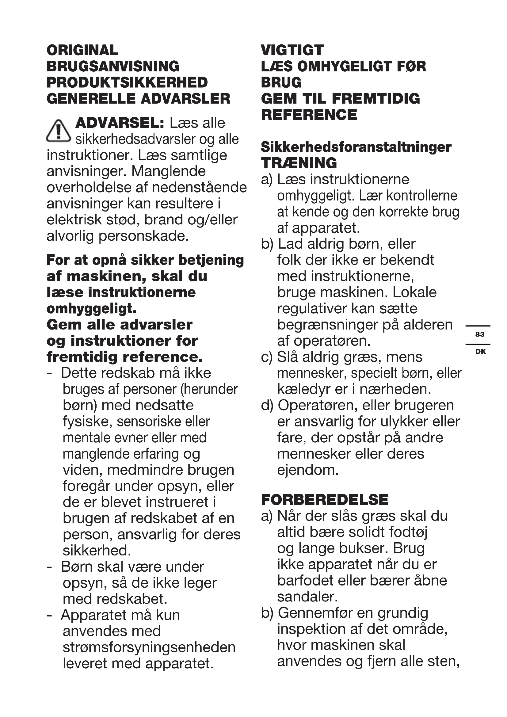 ORIGINAL BRUGSANVISNING PRODUKTSIKKERHED GENERELLE ADVARSLER ADVARSEL: Læs alle sikkerhedsadvarsler og alle instruktioner. Læs samtlige anvisninger. Manglende overholdelse af nedenstående anvisninger kan resultere i elektrisk stød, brand og/eller alvorlig personskade. For at opnå sikker betjening af maskinen, skal du læse instruktionerne omhyggeligt. Gem alle advarsler og instruktioner for fremtidig reference. - Dette redskab må ikke bruges af personer (herunder børn) med nedsatte fysiske, sensoriske eller mentale evner eller med manglende erfaring