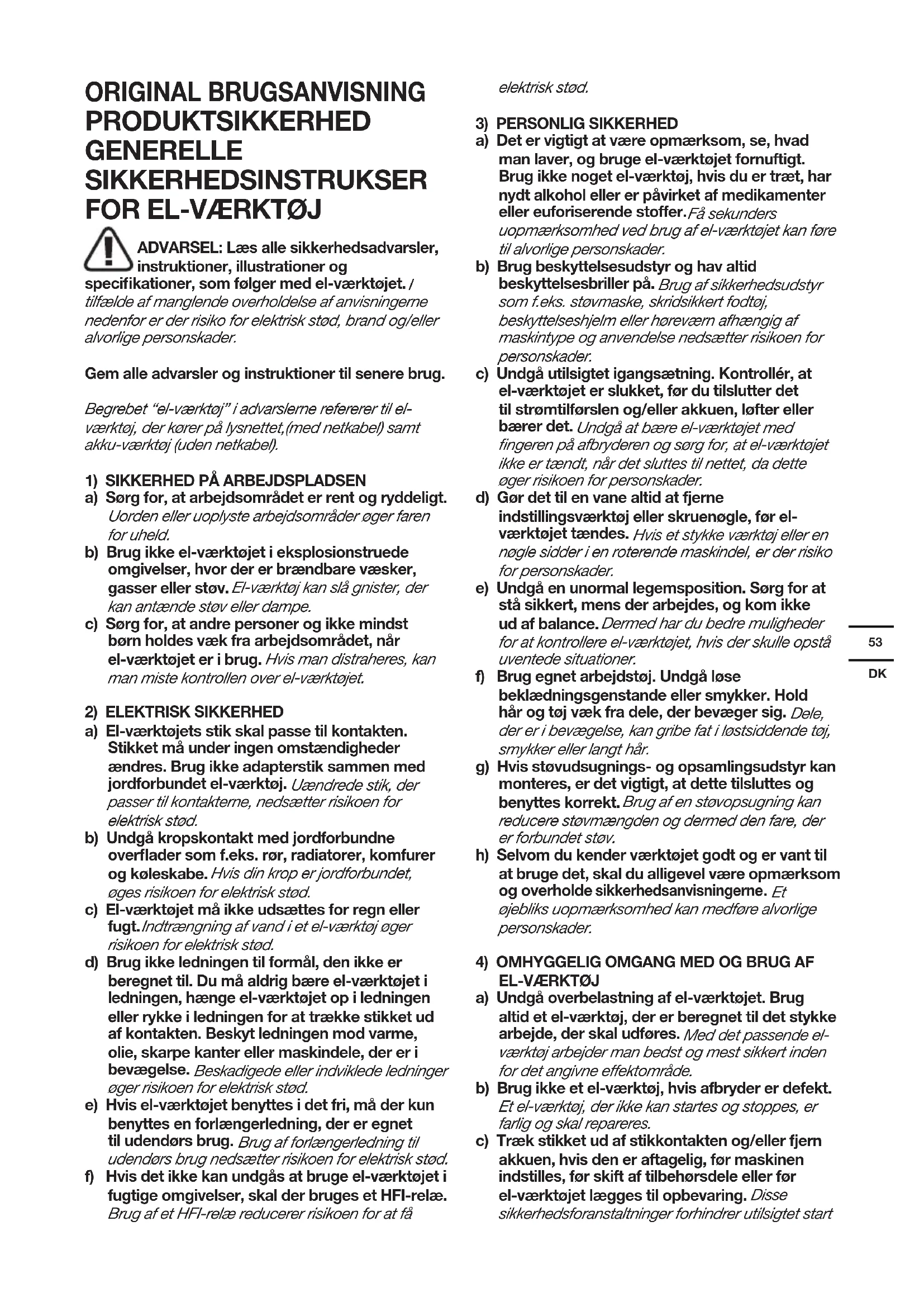 tilfælde af manglende overholdelse af anvisningerne nedenfor er der risiko for elektrisk stød, brand og/eller alvorlige personskader. Gem alle advarsler og instruktioner til senere brug. Begrebet “el-værktøj” i advarslerne refererer til el- værktøj, der kører på lysnettet,(med netkabel) samt akku-værktøj (uden netkabel).