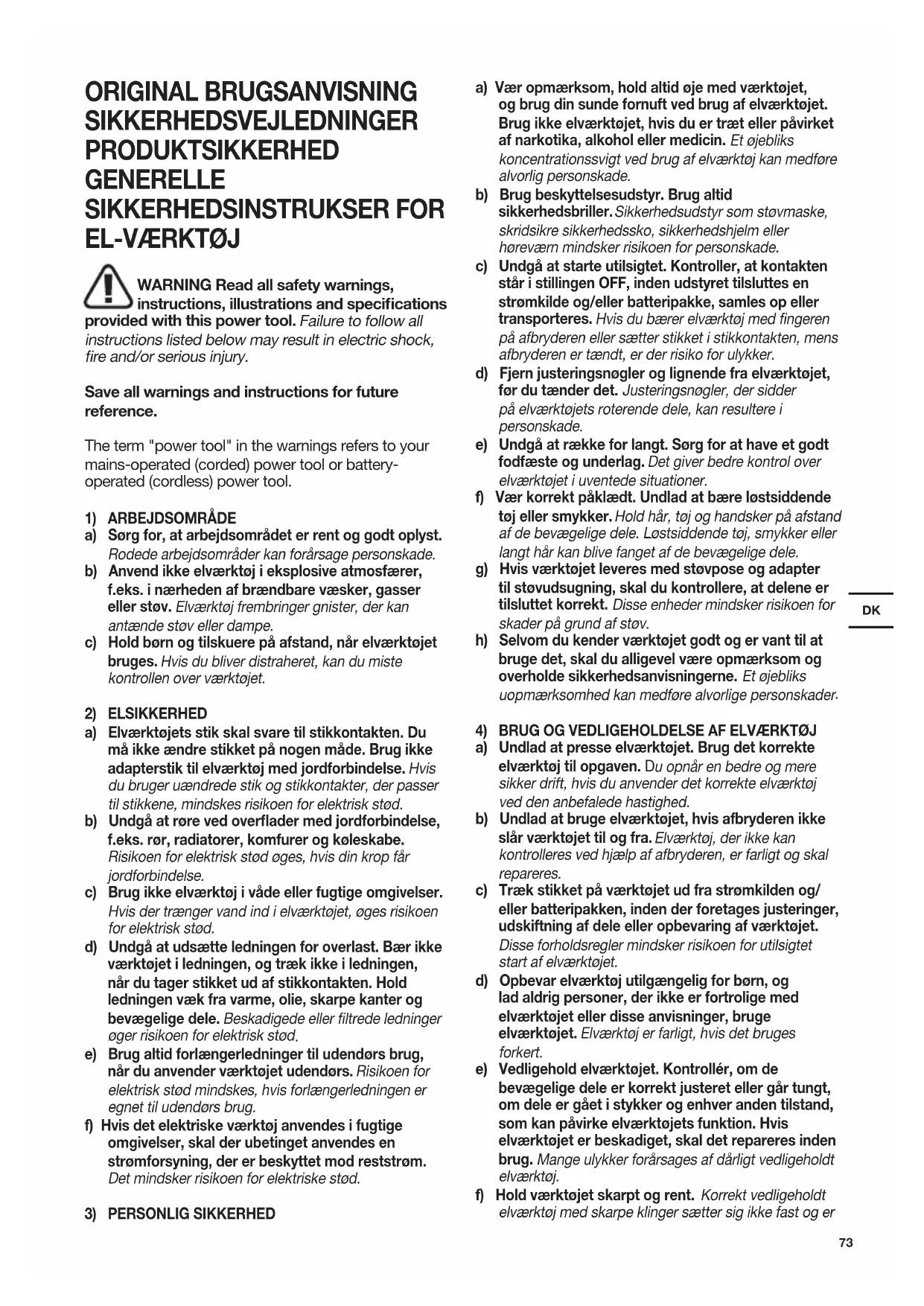 a) Vær opmærksom, hold altid øje med værktøjet, og brug din sunde fornuft ved brug af elværktøjet. Brug ikke elværktøjet, hvis du er træt eller påvirket af narkotika, alkohol eller medicin. Et øjebliks koncentrationssvigt ved brug af elværktøj kan medføre alvorlig personskade. b) Brug beskyttelsesudstyr. Brug altid sikkerhedsbriller. Sikkerhedsudstyr som støvmaske, skridsikre sikkerhedssko, sikkerhedshjelm eller høreværn mindsker risikoen for personskade. c) Undgå at starte utilsigtet. Kontroller, at kontakten står i stillingen OFF, inden udstyret tilsluttes en strømkilde og/eller batteripakke, samles op eller transporteres. Hvis du bærer elværktøj med ngeren på afbryderen eller sætter stikket i stikkontakten, mens afbryderen er tændt, er der risiko for ulykker. d) Fjern justeringsnøgler og lignende fra elværktøjet, før du tænder det. Justeringsnøgler, der sidder på elværktøjets roterende dele, kan resultere i personskade. e) Undgå at række for langt. Sørg for at have et godt fodfæste og underlag. Det giver bedre kontrol over elværktøjet i uventede situationer. f) Vær korrekt påklædt. Undlad at bære løstsiddende tøj eller smykker. Hold hår, tøj og handsker på afstand af de bevægelige dele. Løstsiddende tøj, smykker eller langt hår kan blive fanget af de bevægelige dele. g) Hvis værktøjet leveres med støvpose og adapter til støvudsugning, skal du kontrollere, at delene er tilsluttet korrekt. Disse enheder mindsker risikoen for skader på grund af støv. h) Selvom du kender værktøjet godt og er vant til at bruge det, skal du alligevel være opmærksom og overholde sikkerhedsanvisningerne. Et øjebliks uopmærksomhed kan medføre alvorlige personskader