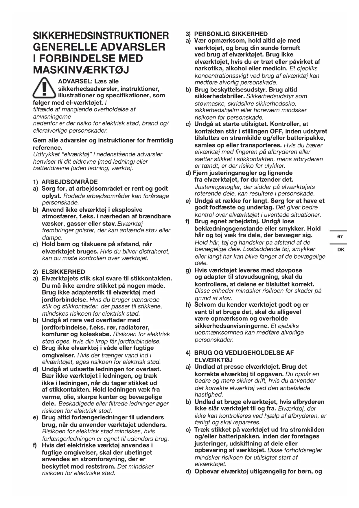 a) Undlad at presse elværktøjet. Brug det korrekte elværktøj til opgaven. Du opnår en bedre og mere sikker drift, hvis du anvender det korrekte elværktøj ved den anbefalede hastighed. b) Undlad at bruge elværktøjet, hvis afbryderen ikke slår værktøjet til og fra. Elværktøj, der ikke kan kontrolleres ved hjælp af afbryderen, er farligt og skal repareres. c) Træk stikket på værktøjet ud fra strømkilden og/eller batteripakken, inden der foretages justeringer, udskiftning af dele eller opbevaring af værktøjet. Disse forholdsregler mindsker risikoen for utilsigtet start af elværktøjet. d) Opbevar elværktøj utilgængelig for børn, og68