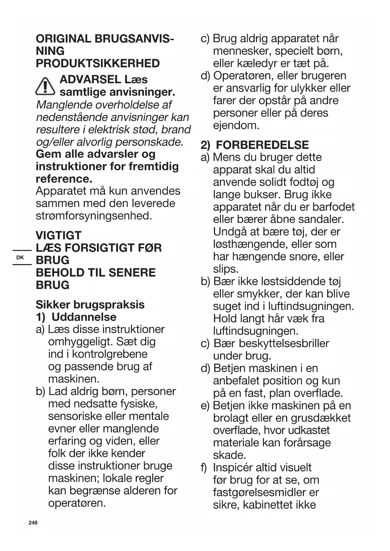a) Mens du bruger dette apparat skal du altid anvende solidt fodtøj og lange bukser. Brug ikke apparatet når du er barfodet eller bærer åbne sandaler. Undgå at bære tøj, der er løsthængende, eller som har hængende snore, eller slips. b) Bær ikke løstsiddende tøj eller smykker, der kan blive suget ind i luftindsugningen. Hold langt hår væk fra luftindsugningen. c) Bær beskyttelsesbriller under brug. d) Betjen maskinen i en anbefalet position og kun på en fast, plan overade. e) Betjen ikke maskinen på en brolagt eller en grusdækket overade, hvor udkastet materiale kan forårsage skade. f) Inspicér altid visuelt før brug for at se, om fastgørelsesmidler er sikre, kabinettet ikkeDK
