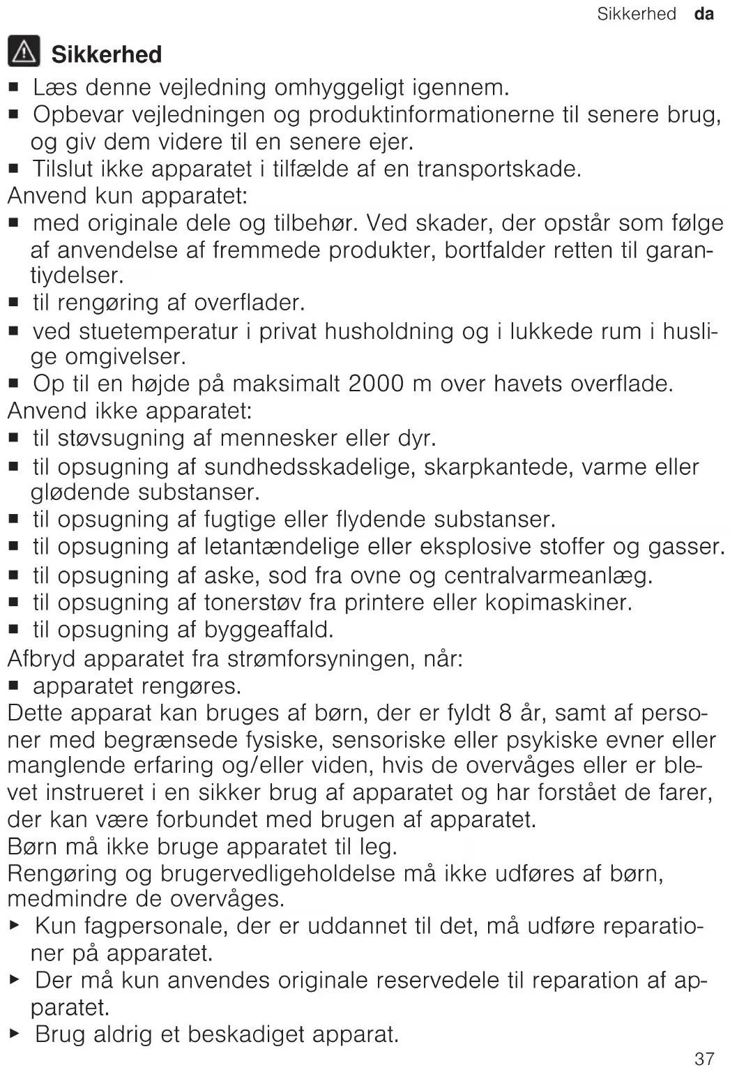 Sikkerhed ¡ Læs denne vejledning omhyggeligt igennem. ¡ Opbevar vejledningen og produktinformationerne til senere brug, og giv dem videre til en senere ejer. ¡ Tilslut ikke apparatet i tilfælde af en transportskade. Anvend kun apparatet: ¡ med originale dele og tilbehør. Ved skader, der opstår som følge af anvendelse af fremmede produkter, bortfalder retten til garan- tiydelser. ¡ til rengøring af overflader. ¡ ved stuetemperatur i privat husholdning og i lukkede rum i husli- ge omgivelser. ¡ Op til en højde på maksimalt 2000m over havets overflade. Anvend ikke apparatet: ¡ til støvsugning af mennesker eller dyr. ¡ til opsugning af sundhedsskadelige, skarpkantede, varme eller glødende substanser. ¡ til opsugning af fugtige eller flydende substanser. ¡ til opsugning af letantændelige eller eksplosive stoffer og gasser. ¡ til opsugning af aske, sod fra ovne og centralvarmeanlæg. ¡ til opsugning af tonerstøv fra printere eller kopimaskiner. ¡ til opsugning af byggeaffald. Afbryd apparatet fra strømforsyningen, når: ¡ apparatet rengøres. Dette apparat kan bruges af børn, der er fyldt 8 år, samt af perso- ner med begrænsede fysiske, sensoriske eller psykiske evner eller manglende erfaring og/eller viden, hvis de overvåges eller er ble- vet instrueret i en sikker brug af apparatet og har forstået de farer, der kan være forbundet med brugen af apparatet. Børn må ikke bruge apparatet til leg. Rengøring og brugervedligeholdelse må ikke udføres af børn, medmindre de overvåges. ▶ Kun fagpersonale, der er uddannet til det, må udføre reparatio- ner på apparatet. ▶ Der må kun anvendes originale reservedele til reparation af ap- paratet. ▶ Brug aldrig et beskadiget apparat.da Sikkerhed