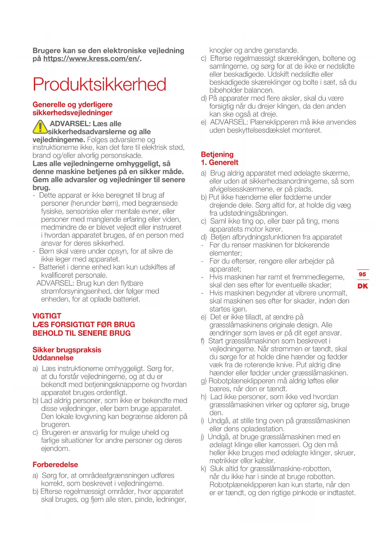 Brugere kan se den elektroniske vejledning på https://www.kress.com/en/. Produktsikkerhed Generelle og yderligere sikkerhedsvejledninger ADVARSEL: Læs alle sikkerhedsadvarslerne og alle vejledningerne. Følges advarslerne og instruktionerne ikke, kan det føre til elektrisk stød, brand og/eller alvorlig personskade. Læs alle vejledningerne omhyggeligt, så denne maskine betjenes på en sikker måde. Gem alle advarsler og vejledninger til senere brug. - Dette apparat er ikke beregnet til brug af personer (herunder børn), med begrænsede fysiske, sensoriske eller mentale evner, eller personer med manglende erfaring eller viden, medmindre de er blevet vejledt eller instrueret i hvordan apparatet bruges, af en person med ansvar for deres sikkerhed. - Børn skal være under opsyn, for at sikre de ikke leger med apparatet. - Batteriet i denne enhed kan kun udskiftes af kvalificeret personale. ADVARSEL: Brug kun den flytbare strømforsyningsenhed, der følger med enheden, for at oplade batteriet. VIGTIGT