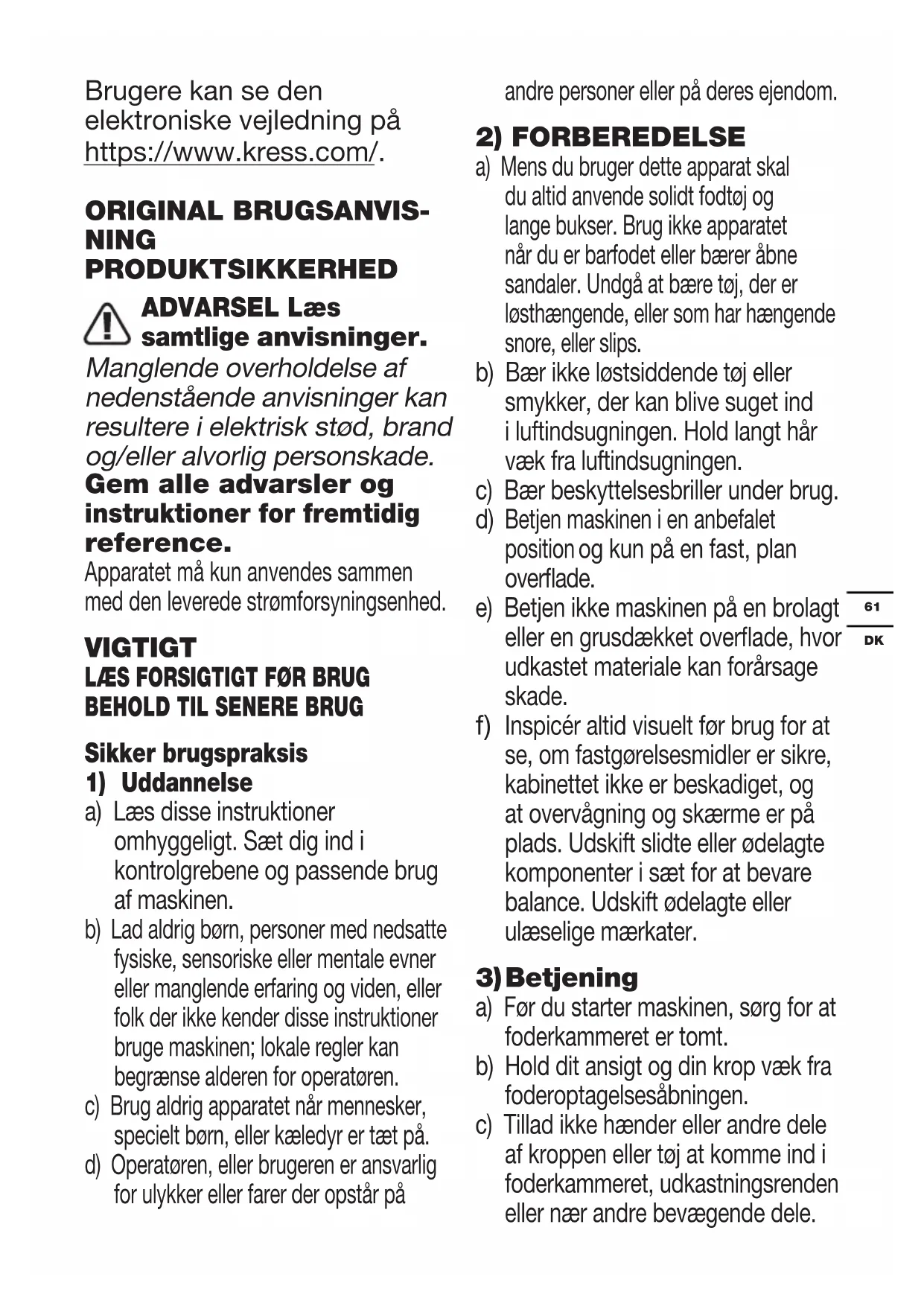 a) Læs disse instruktioner omhyggeligt. Sæt dig ind i kontrolgrebene og passende brug af maskinen. b) Lad aldrig børn, personer med nedsatte fysiske, sensoriske eller mentale evner eller manglende erfaring og viden, eller folk der ikke kender disse instruktioner bruge maskinen; lokale regler kan begrænse alderen for operatøren. c) Brug aldrig apparatet når mennesker, specielt børn, eller kæledyr er tæt på. d) Operatøren, eller brugeren er ansvarlig for ulykker eller farer der opstår på andre personer eller på deres ejendom.