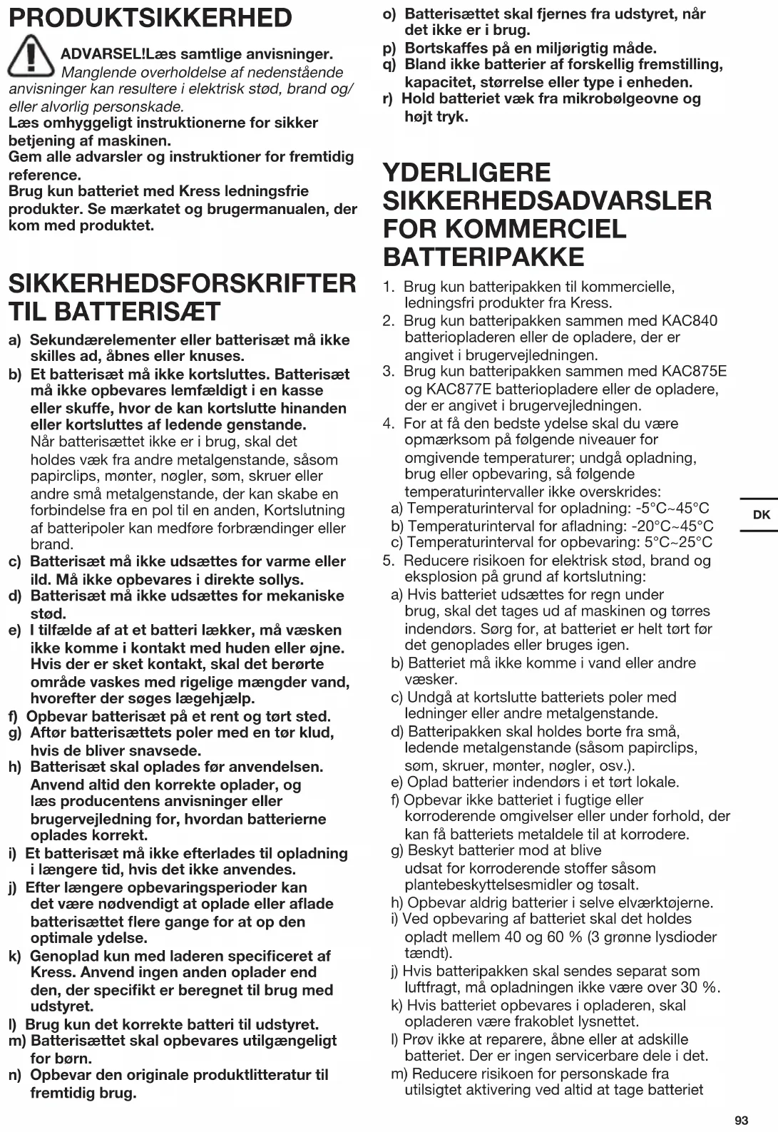 i længere tid, hvis det ikke anvendes. j) Efter længere opbevaringsperioder kan det være nødvendigt at oplade eller aflade batterisættet flere gange for at op den optimale ydelse. k) Genoplad kun med laderen specificeret af Kress. Anvend ingen anden oplader end den, der specifikt er beregnet til brug med udstyret. l) Brug kun det korrekte batteri til udstyret. m) Batterisættet skal opbevares utilgængeligt for børn. n) Opbevar den originale produktlitteratur til fremtidig brug. o) Batterisættet skal fjernes fra udstyret, når det ikke er i brug. p) Bortskaffes på en miljørigtig måde. q) Bland ikke batterier af forskellig fremstilling, kapacitet, størrelse eller type i enheden. r) Hold batteriet væk fra mikrobølgeovne og højt tryk. YDERLIGERE SIKKERHEDSADVARSLER FOR KOMMERCIEL BATTERIPAKKE