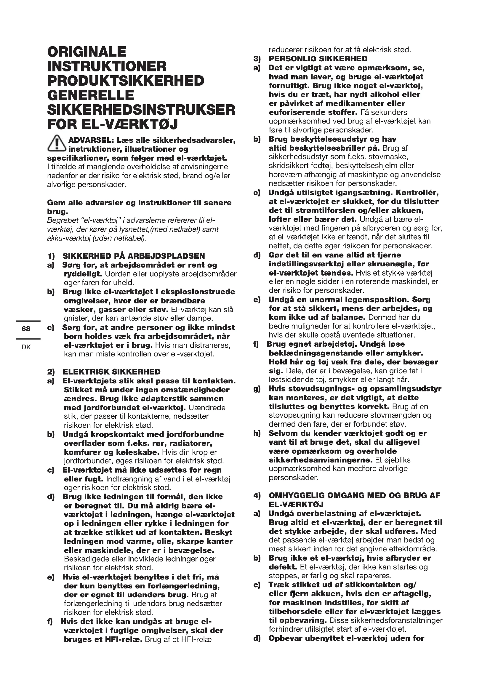 ADVARSEL: Læs alle sikkerhedsadvarsler, instruktioner, illustrationer og specifikationer, som følger med el-værktøjet. I tilfælde af manglende overholdelse af anvisningerne nedenfor er der risiko for elektrisk stød, brand og/eller alvorlige personskader. Gem alle advarsler og instruktioner til senere brug. Begrebet “el-værktøj” i advarslerne refererer til el- værktøj, der kører på lysnettet,(med netkabel) samt akku-værktøj (uden netkabel).