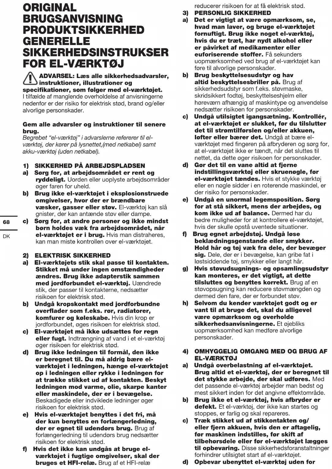 ADVARSEL: Læs alle sikkerhedsadvarsler, instruktioner, illustrationer og specifikationer, som følger med el-værktøjet. I tilfælde af manglende overholdelse af anvisningerne nedenfor er der risiko for elektrisk stød, brand og/eller alvorlige personskader. Gem alle advarsler og instruktioner til senere brug. Begrebet “el-værktøj” i advarslerne refererer til el- værktøj, der kører på lysnettet,(med netkabel) samt akku-værktøj (uden netkabel).