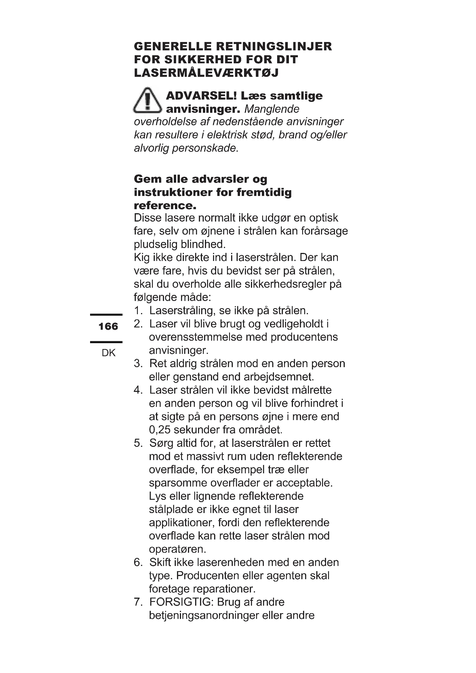 ADVARSEL! Læs samtlige anvisninger. Manglende overholdelse af nedenstående anvisninger kan resultere i elektrisk stød, brand og/eller alvorlig personskade. Gem alle advarsler og instruktioner for fremtidig reference. Disse lasere normalt ikke udgør en optisk fare, selv om øjnene i strålen kan forårsage pludselig blindhed. Kig ikke direkte ind i laserstrålen. Der kan være fare, hvis du bevidst ser på strålen, skal du overholde alle sikkerhedsregler på følgende måde: