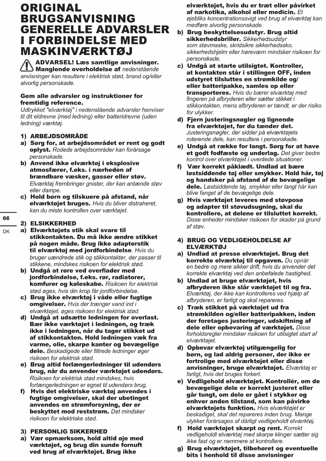 a) Undlad at presse elværktøjet. Brug det korrekte elværktøj til opgaven. Du opnår en bedre og mere sikker drift, hvis du anvender det korrekte elværktøj ved den anbefalede hastighed. b) Undlad at bruge elværktøjet, hvis afbryderen ikke slår værktøjet til og fra. Elværktøj, der ikke kan kontrolleres ved hjælp af afbryderen, er farligt og skal repareres. c) Træk stikket på værktøjet ud fra strømkilden og/eller batteripakken, inden der foretages justeringer, udskiftning af dele eller opbevaring af værktøjet. Disse forholdsregler mindsker risikoen for utilsigtet start af elværktøjet. d) Opbevar elværktøj utilgængelig for børn, og lad aldrig personer, der ikke er fortrolige med elværktøjet eller disse anvisninger, bruge elværktøjet. Elværktøj er farligt, hvis det bruges forkert. e) Vedligehold elværktøjet. Kontrollér, om de bevægelige dele er korrekt justeret eller går tungt, om dele er gået i stykker og enhver anden tilstand, som kan påvirke elværktøjets funktion. Hvis elværktøjet er beskadiget, skal det repareres inden brug. Mange ulykker forårsages af dårligt vedligeholdt elværktøj. f) Hold værktøjet skarpt og rent. Korrekt vedligeholdt elværktøj med skarpe klinger sætter sig ikke fast og er nemmere at kontrollere. g) Brug elværktøjet, tilbehøret og eventuelle bits i henhold til disse anvisninger67