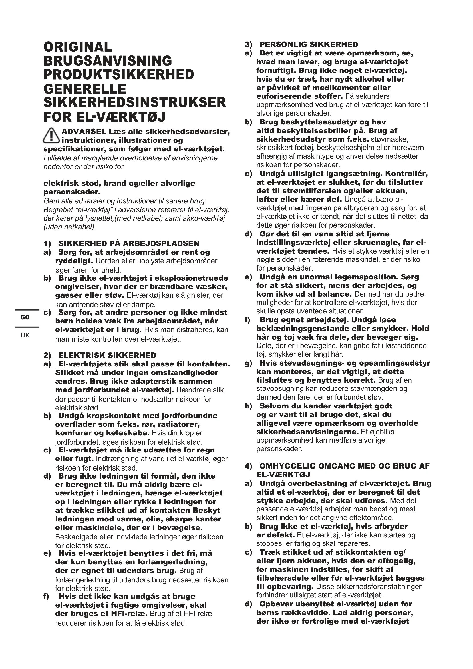 h,ID = 5.98m/s² Usikkerhed K = 1.5m/s² Den angivne vibrationstotalværdi og den deklarerede støjemissionsværdi er målt i overensstemmelse med en standard testmetode og kan bruges til at sammenligne et værktøj med et andet. Den angivne vibrationenstotalværdi og den angivne støjemissionsværdi kan også anvendes i en foreløbig vurdering af eksponeringen. ADVARSEL: Vibrationer og støjemissioner under selve brugen af elværktøjet kan afvige fra den deklarerede værdi afhængigt af, hvordan værktøjet bruges, især hvad slags emne behandles afhængigt af følgende eksempler og andre variationer af, hvordan værktøjet bliver brugt: Hvordan værktøjet bruges og materialerne skæres eller bores. Værktøjets stand og vedligeholdelse. Anvendelse af korrekt tilbehør og kontrol med, at det er skarpt og i en i det hele taget god tilstand. Hvor kraftigt, der holdes fast i håndtaget og, om der benyttes antivibrationsudstyr. Om værktøjet anvendes i henhold til dets konstruktion og nærværende anvisninger. Værktøjet kan medføre et hånd/arm- vibrationssyndrom, hvis det ikke bruges på rigtig måde. ADVARSEL: En vurdering af udsættelsesgraden under det aktuelle brug skal omfatte alle dele af arbejdscyklussen, hherunder53