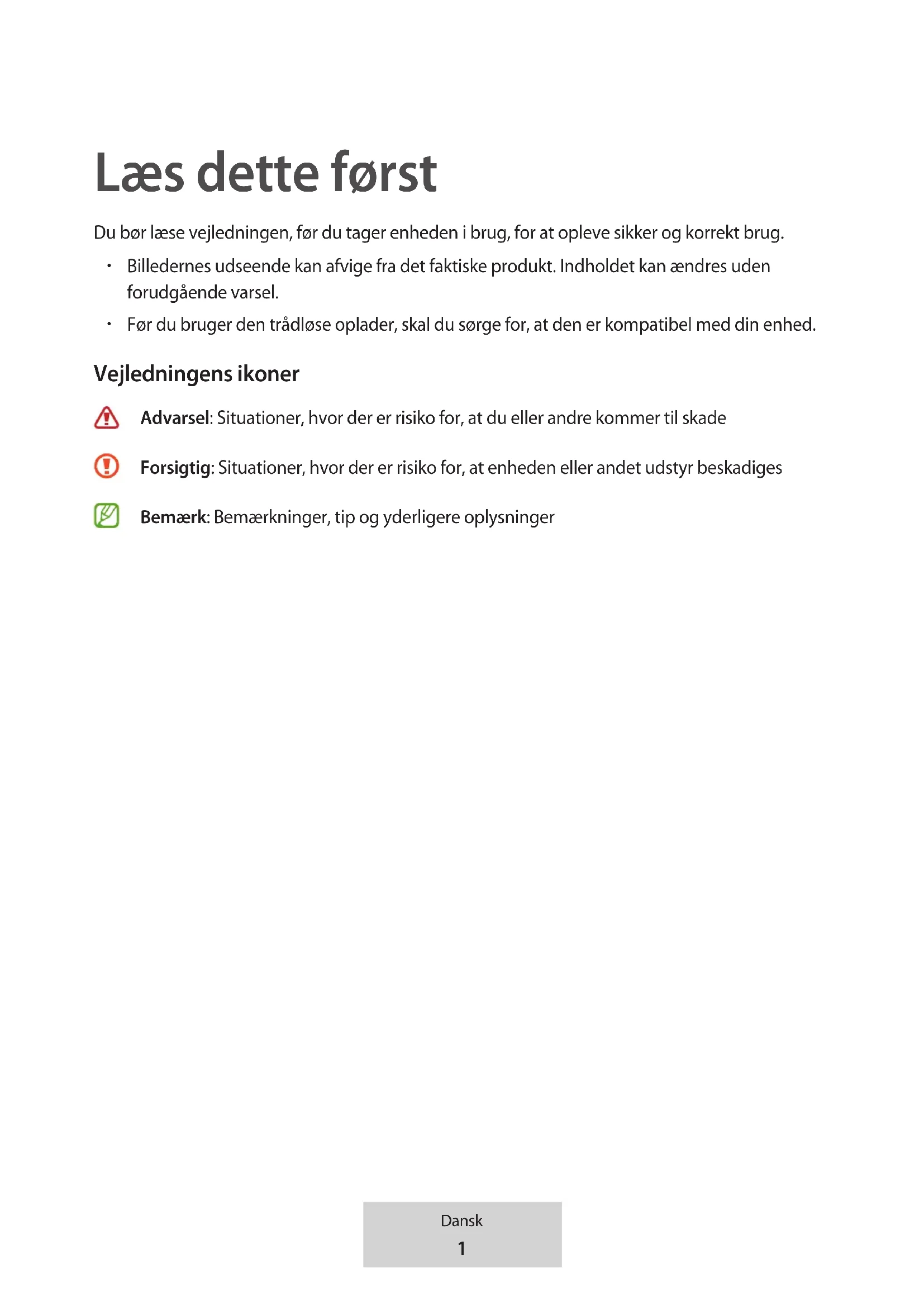 Kaikki muut tavaramerkit ja tekijänoikeudet kuuluvat niiden omistajille.1 Dansk Læs dette først Du bør læse vejledningen, før du tager enheden i brug, for at opleve sikker og korrekt brug.