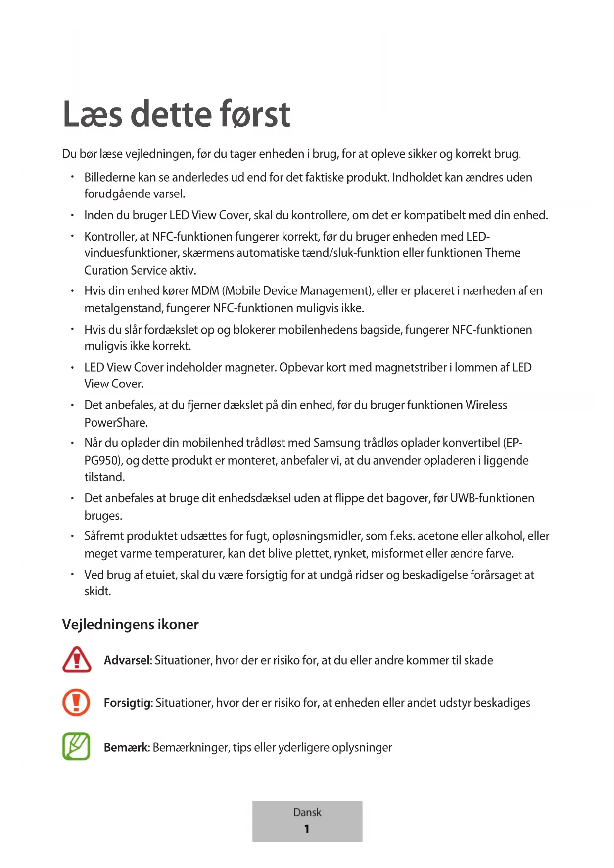 Ved brug af etuiet, skal du være forsigtig for at undgå ridser og beskadigelse forårsaget at skidt. Vejledningens ikoner Advarsel: Situationer, hvor der er risiko for, at du eller andre kommer til skade Forsigtig: Situationer, hvor der er risiko for, at enheden eller andet udstyr beskadiges Bemærk: Bemærkninger, tips eller yderligere oplysninger Dansk