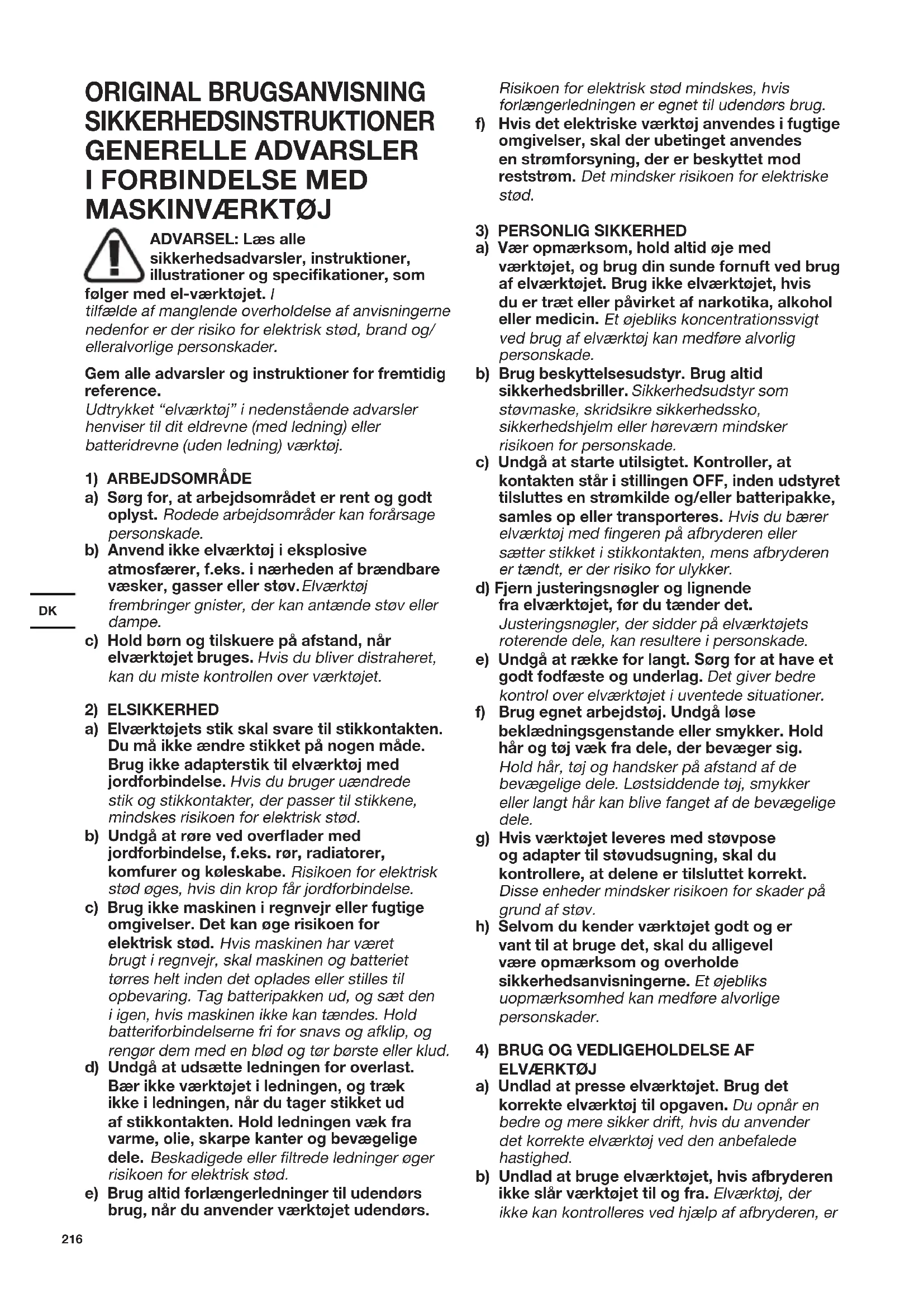 tilfælde af manglende overholdelse af anvisningerne nedenfor er der risiko for elektrisk stød, brand og/ elleralvorlige personskader. Gem alle advarsler og instruktioner for fremtidig reference. Udtrykket “elværktøj” i nedenstående advarsler henviser til dit eldrevne (med ledning) eller batteridrevne (uden ledning) værktøj.