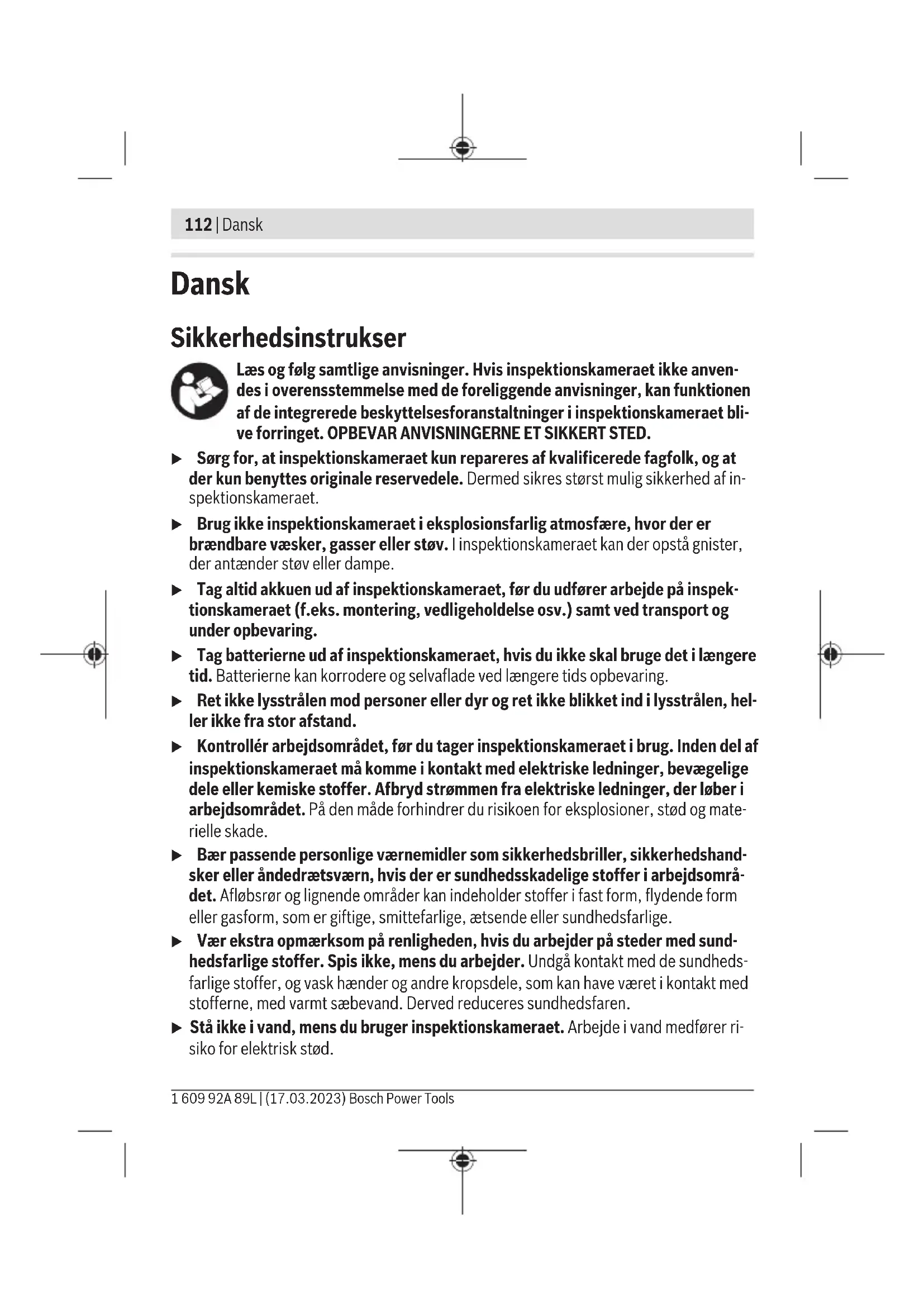 - <Sluk efter…>: Vælg den tid, der skal gå, før inspektionskameraet automatisk slukker, hvis der ikke trykkes på nogen knap. – <Enhedsinfo>: Her finder du oplysninger om værktøjer som f.eks. installeret softwa- re-version og juridiske oplysninger. – <Fabriksindstillinger>: Du kan nulstille alle menupunkter til fabriksindstillinger. Samtidig slettes alle gemte filer endegyldigt. Lagring/overførsel af optagelser Optagelse af et foto/video Hvis der er isat et Micro-SD-kort(20), gemmes fotos og videoer der. Uden et Micro-SD-kort gemmes fotos i inspektionskameraets interne hukommelse. Det er ikke muligt at optage video. Fototilstand: Tryk på knappen Foto-/videooptagelse(12) for at tage et billede af den ak- tuelle displayvisning. Videotilstand: Tryk på knappen Foto-/videooptagelse(12) for at starte en videoop- tagelse. Tryk på knappen Foto-/videooptagelse(12) eller den midterste knap(9) for at afslutte videooptagelse. Du kan skifte mellem foto- og videooptagelse via <Hovedmenu>. Oversigt over dataoverførsel – Overførsel af fotofiler fra den interne hukommelse til Micro-SD-kortet(20): Når du isætter et Micro-SD-kort(20), bliver du på displayet spurgt, om du ønsker at overføre de data, der er gemt i inspektionskameraets interne hukommelse, til micro-SD-kortet. Bosch Power Tools 1 609 92A 89L | (17.03.2023)122 | Dansk – Overførsel af fotofiler fra den interne hukommelse via USBType‑C®: Overførsel kan kun finde sted, hvis der ikke er sat et Micro-SD-kort(20) i inspektionskameraet. – Overførsel af filer fra Micro-SD-kortet(20): Du kan enten overføre filer fra det isatte Micro-SD-kort(20) via USBType‑C® eller tage Micro-SD-kortet(20) ud og sætte det i en anden enhed. Isætning af Micro-SD-kort Åbn det øverste dæksel(16), og skub Micro-SD-kortet(20) ind i porten(18), indtil det stopper. Husk at vende det rigtigt. Luk det øverste dæksel omhyggeligt igen. Dataoverførsel via USBType-C®-brugerflade Tænd inspektionskameraet for at foretage dataoverførsel via USBType‑C®. Åbn afdæk- ningen til USBType-C®-bøsningen(17). Forbind USBType‑C®-bøsningen via USBTy- pe‑C®-kablet(19) med din pc. Åbn filbrowseren på pc'en, og vælg drevet til overførsel af filer. Navnet på drevet lyder: – hvis der ikke er sat noget Micro-SD-kort i inspektionskameraet: Bosch_GIC – hvis der er sat et Micro-SD-kort uden navn i inspektionskameraet: standardnavnet på USB-drevet – hvis der er sat et Micro-SD-kort med navn i inspektionskameraet: navnet på Micro-SD- kortet De gemte filer kan kopieres fra inspektionskameraets interne hukommelse eller Micro- SD-kort og flyttes over på pc'en eller slettes. Så snart den ønskede proces er afsluttet, skal du afbryde forbindelsen til drevet som sædvanlig. Bemærk: Afbryd altid først drevet fra pc'ens operativsystem (skub ud), da inspektions- kameraets interne hukommelse ellers kan tage skade. Fjern USBType-C®-kablet (inspektionskameraet slukker i den forbindelse automatisk). Luk den øverste afdækning til porten(16) for at beskytte mod støv og vandstænk. Bemærk: Brug altid kun USB Type-C®-brugerfladen, når du forbinder inspektionskame- raet med en pc. Hvis du slutter inspektionskameraet til andre enheder, kan det tage skade. Bemærk: USB Type-C®-brugerfladen bruges udelukkende til dataoverførsel. Den kan ik- ke bruges til opladning af batterier eller andre apparater. Arbejdsanvisning Kontrollér de omgivelser, du ønsker at inspicere, og vær særligt opmærksom på forhin- dringer og farlige steder. 1 609 92A 89L | (17.03.2023) Bosch Power ToolsDansk | 123 Bøj kamerakablet(1), så kamerahovedet uden problemer kan føres ind i de omgivelser, som skal undersøges. Før kamerakablet forsigtigt ind. Tilpas lysstyrken til kameralyset(3), så det er let at se billedet. Ved f.eks. kraftigt reflek- terende genstande kan du for eksempel opnå et bedre billede med mindre lys eller med indstilling af sort-hvid-kontrast. Hvis de genstande, som skal undersøges, vises uskarpt, skal du reducere eller øge af- standen mellem kamerahoved(2) og genstand. Fejl – årsager og afhjælpning Fejlvisning på displayet Årsag Afhjælpning (gul advarsel) Intern hukommelse næsten fuld Slet filer fra den interne hukommelse, eller isæt et Micro-SD-kort(20). (rød advarsel) Intern hukommelse fuld Slet filer fra den interne hukommelse, eller isæt et Micro-SD-kort(20). Fejl i den interne hukommelse Genstart inspektionskameraet. Hvis problemet fortsætter, skal du kontakte et autoriseretBosch -kundeservicecenter.