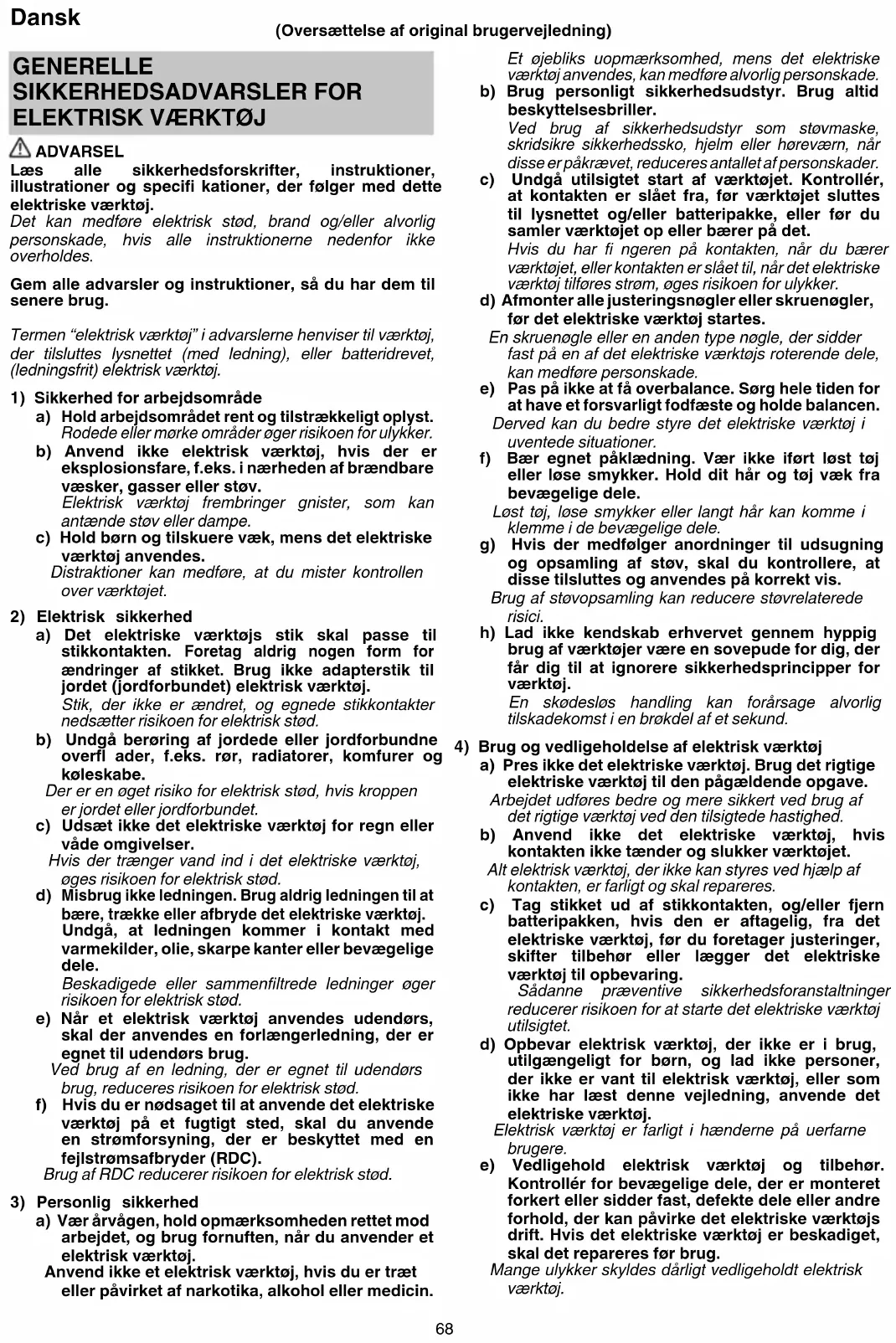 a) Vær årvågen, hold opmærksomheden rettet mod arbejdet, og brug fornuften, når du anvender et elektrisk værktøj. Anvend ikke et elektrisk værktøj, hvis du er træt eller påvirket af narkotika, alkohol eller medicin. (Oversættelse af original brugervejledning) 0000BookCV12DA.indb680000BookCV12DA.indb68 2019/12/1612:36:592019/12/1612:36:5969 Dansk f) Sørg for, at skæreværktøj er skarpt og rent. Der er mindre risiko for, at korrekt vedligeholdt skæreværktøj med skarpe kanter sætter sig fast, og det er nemmere at styre. g) Brug det elektriske værktøj, tilbehør og bits osv. i overensstemmelse med denne vejledning under hensyntagen til arbejdsforholdene og det arbejde, der skal udføres. Der kan opstå farlige situationer, hvis det elektriske værktøj bruges til andre formål end de tilsigtede. h) Hold håndtag og gribefl ader tørre, rene og fri for olie og fedt. Glatte håndtag og gribefl ader gør sikker håndtering og kontrol over værktøjet i uventede situationer umulig.