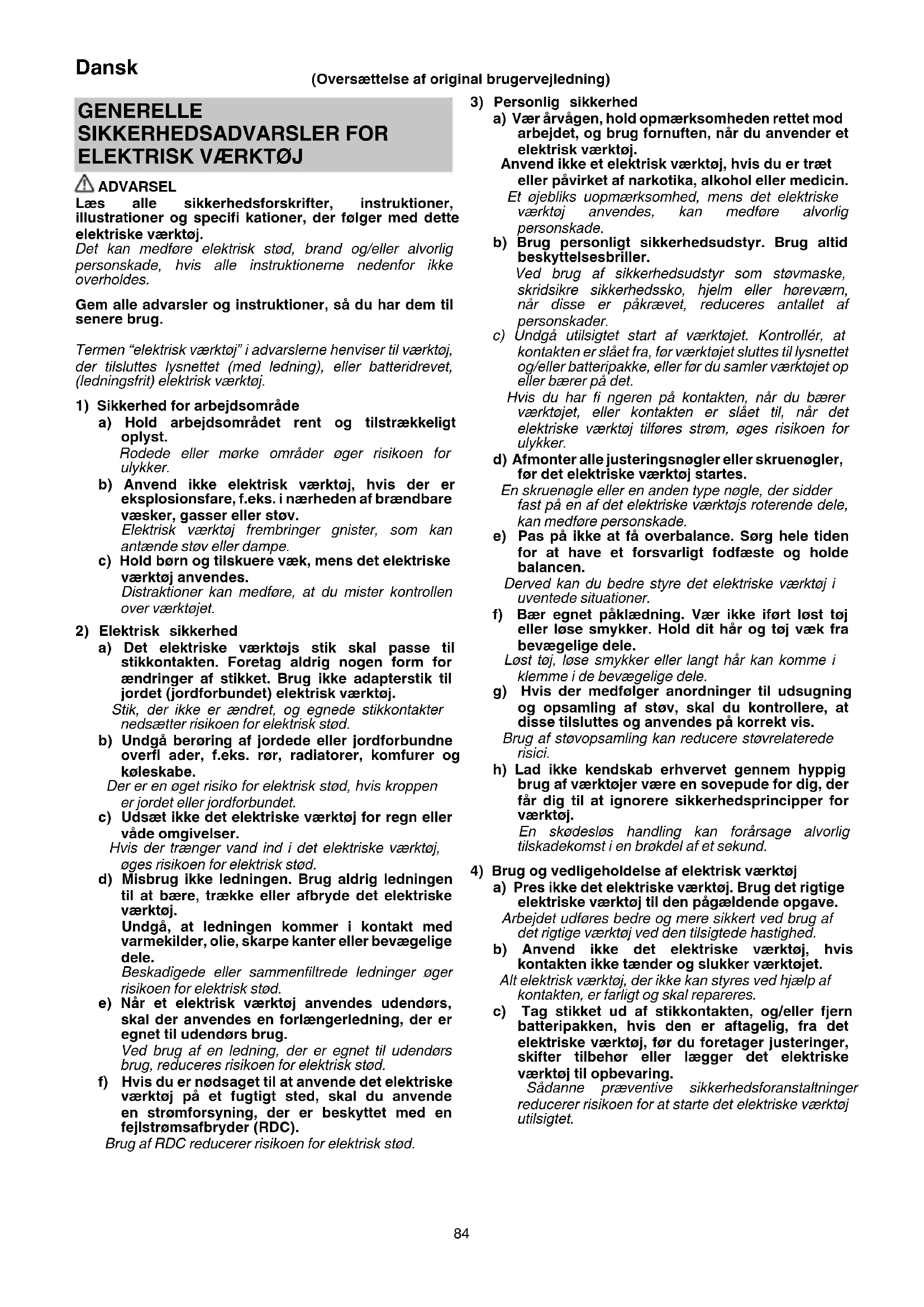 ADVARSEL Læs alle sikkerhedsforskrifter, instruktioner, illustrationer og specifi kationer, der følger med dette elektriske værktøj. Det kan medføre elektrisk stød, brand og/eller alvorlig personskade, hvis alle instruktionerne nedenfor ikke overholdes. Gem alle advarsler og instruktioner, så du har dem til senere brug. Termen “elektrisk værktøj” i advarslerne henviser til værktøj, der tilsluttes lysnettet (med ledning), eller batteridrevet, (ledningsfrit) elektrisk værktøj.