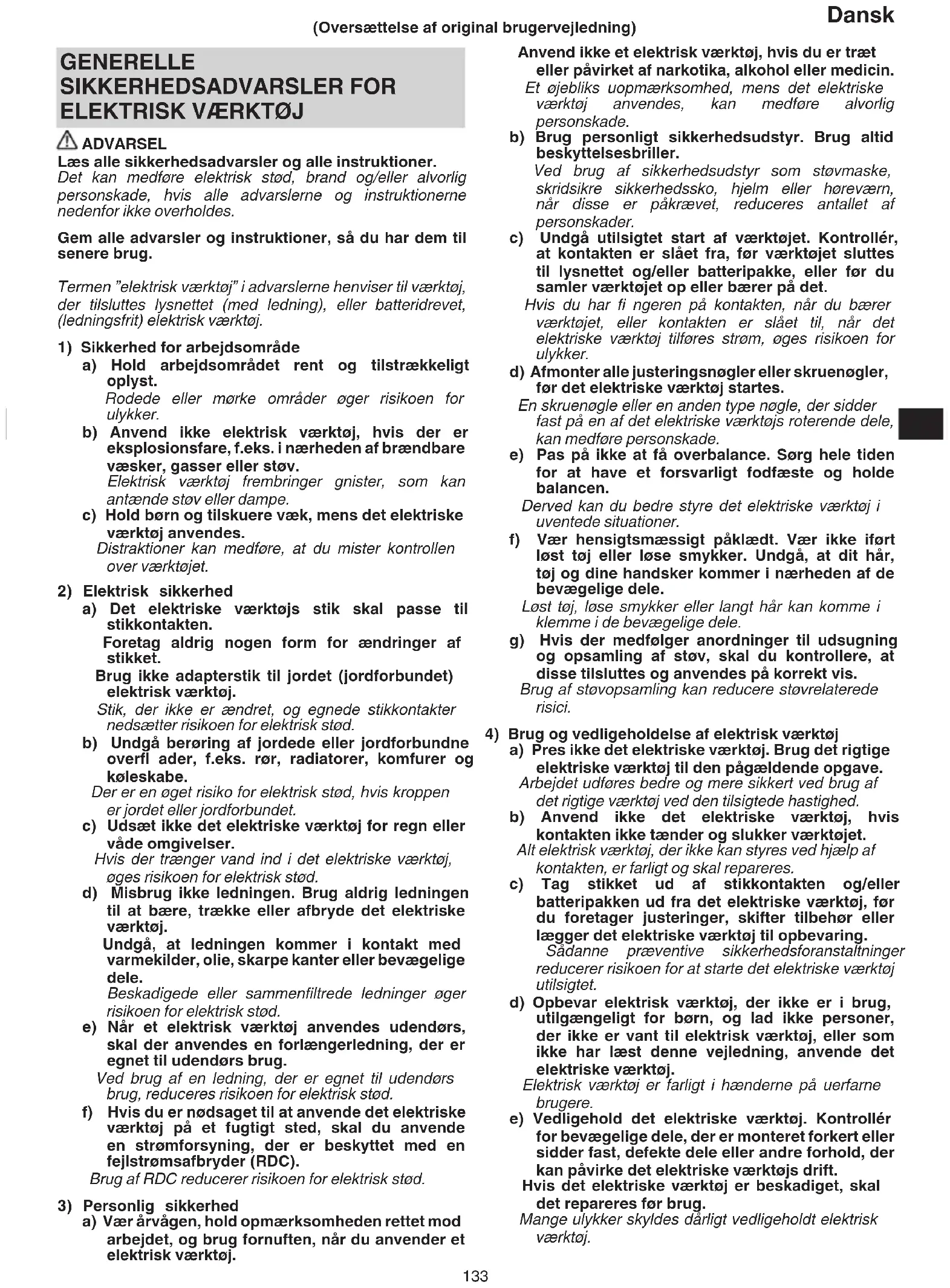 a) Vær årvågen, hold opmærksomheden rettet mod arbejdet, og brug fornuften, når du anvender et elektrisk værktøj. (Oversættelse af original brugervejledning) 00BookNR1890DBCL.indb13300BookNR1890DBCL.indb133 2020/08/0711:39:152020/08/0711:39:15134 Dansk f) Sørg for, at skæreværktøj er skarpt og rent. Der er mindre risiko for, at korrekt vedligeholdt skæreværktøj med skarpe kanter sætter sig fast, og det er nemmere at styre. g) Brug det elektriske værktøj, tilbehør og bits osv. i overensstemmelse med denne vejledning under hensynstagen til arbejdsforholdene og det arbejde, der skal udføres. Der kan opstå farlige situationer, hvis det elektriske værktøj bruges til andre formål end de tilsigtede.