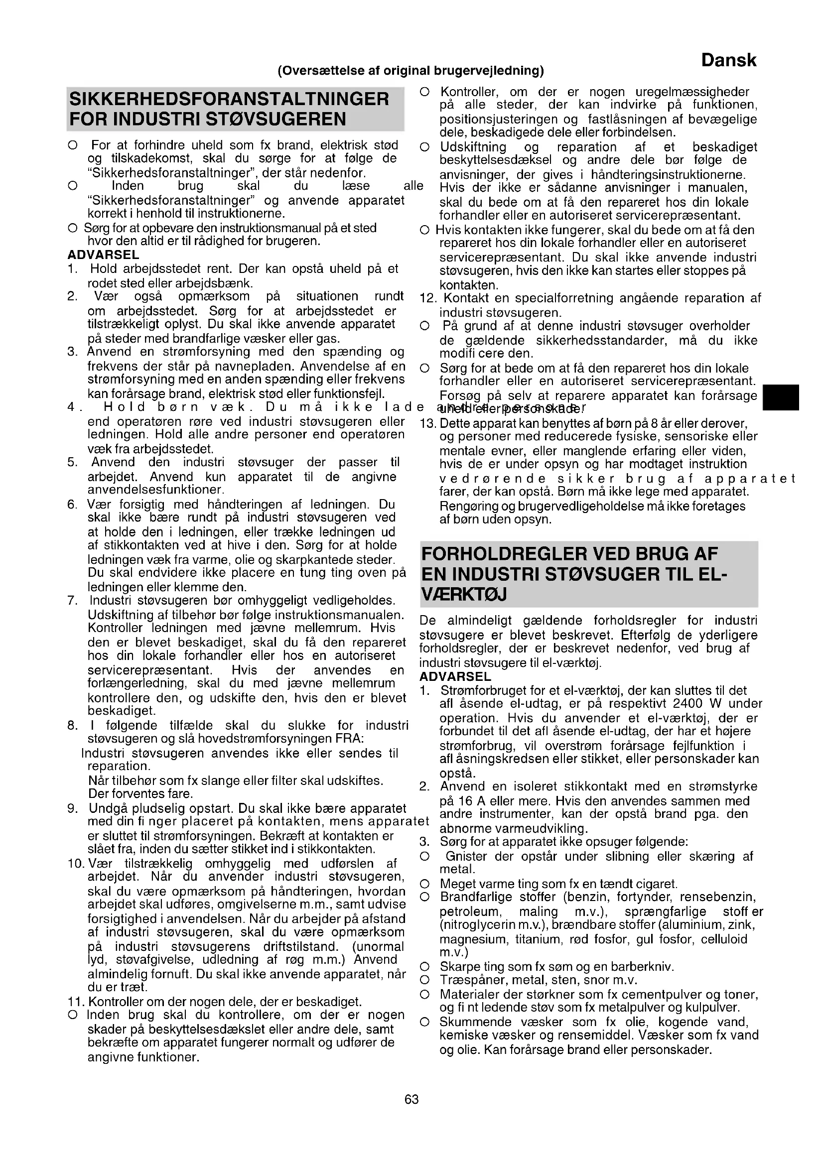 industri støvsugeren. ○ På grund af at denne industri støvsuger overholder de gældende sikkerhedsstandarder, må du ikke modifi cere den. ○ Sørg for at bede om at få den repareret hos din lokale forhandler eller en autoriseret servicerepræsentant. Forsøg på selv at reparere apparatet kan forårsage uheld eller personskade.