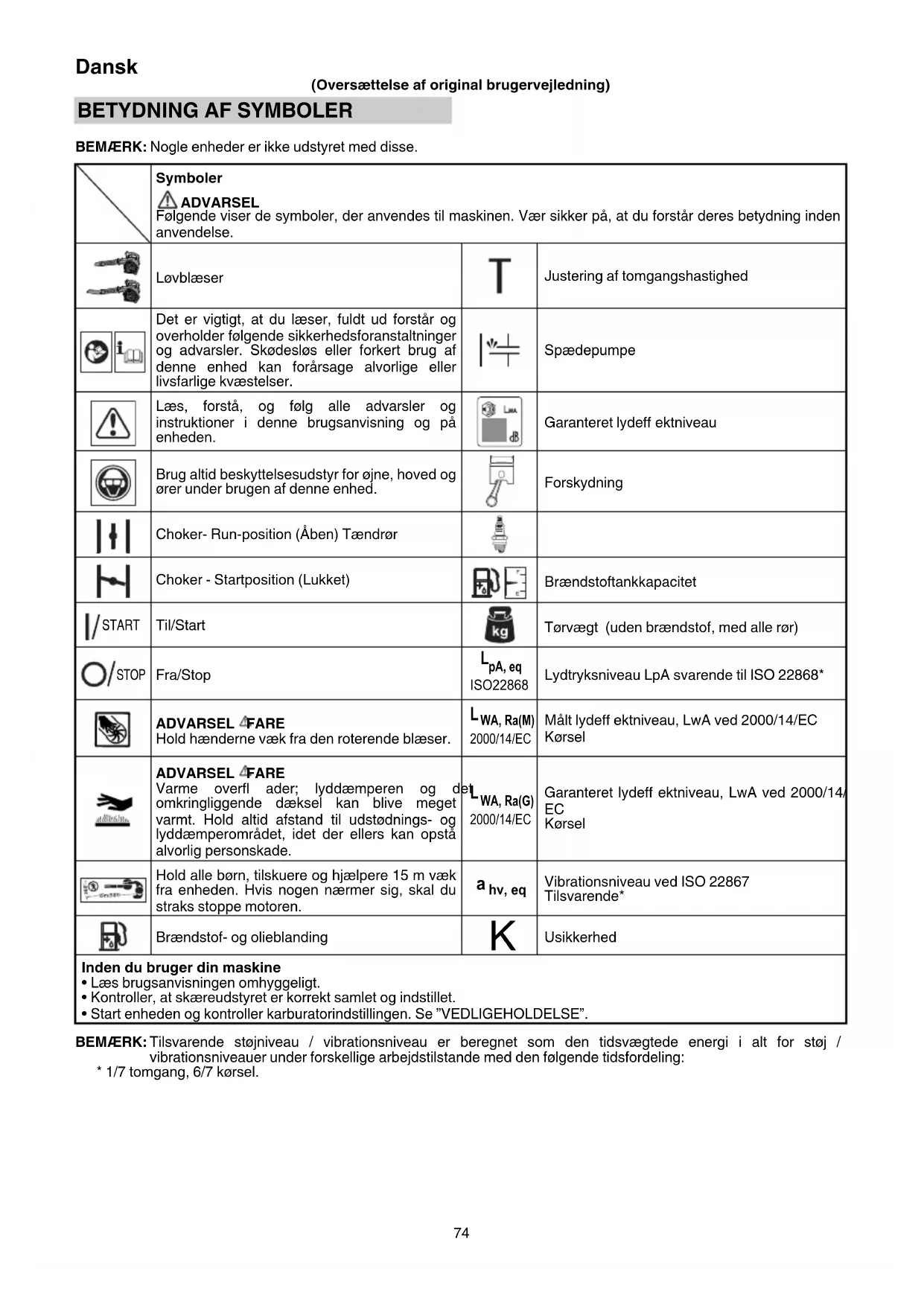 BEMÆRK: Nogle enheder er ikke udstyret med disse. Symboler ADVARSEL Følgende viser de symboler, der anvendes til maskinen. Vær sikker på, at du forstår deres betydning inden anvendelse. Løvblæser Justering af tomgangshastighed Det er vigtigt, at du læser, fuldt ud forstår og overholder følgende sikkerhedsforanstaltninger og advarsler. Skødesløs eller forkert brug af denne enhed kan forårsage alvorlige eller livsfarlige kvæstelser. Spædepumpe Læs, forstå, og følg alle advarsler og instruktioner i denne brugsanvisning og på enheden. Garanteret lydeff ektniveau Brug altid beskyttelsesudstyr for øjne, hoved og ører under brugen af denne enhed. Forskydning Choker- Run-position (Åben) Tændrør Choker - Startposition (Lukket) Brændstoftankkapacitet START Til/Start Tørvægt (uden brændstof, med alle rør) STOP Fra/Stop