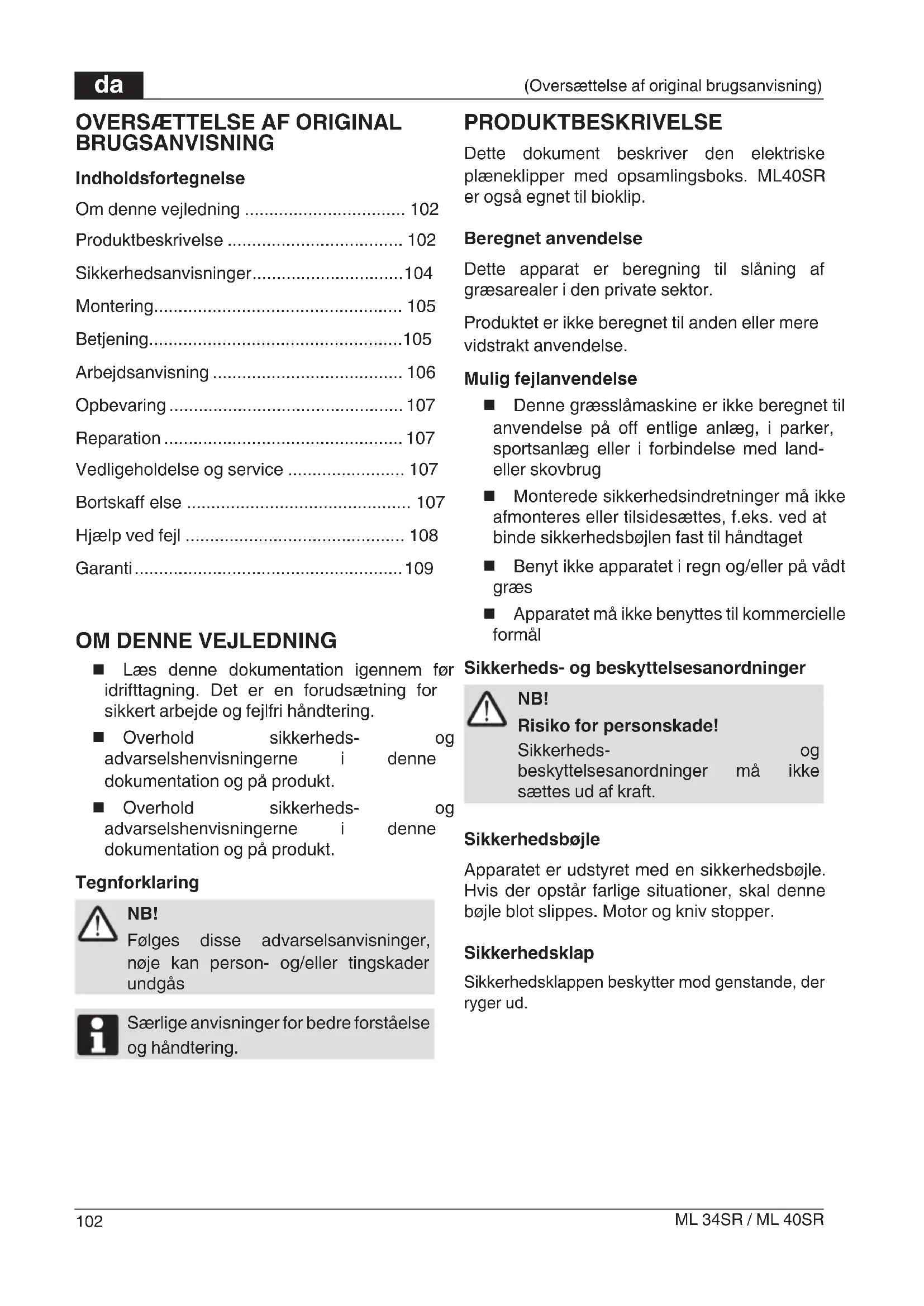 Læs denne dokumentation igennem før idrifttagning. Det er en forudsætning for sikkert arbejde og fejlfri håndtering. Overhold sikkerheds- og advarselshenvisningerne i denne dokumentation og på produkt. Overhold sikkerheds- og advarselshenvisningerne i denne dokumentation og på produkt. Tegnforklaring NB! Følges disse advarselsanvisninger, nøje kan person- og/eller tingskader undgås Særlige anvisninger for bedre forståelse og håndtering. PRODUKTBESKRIVELSE Dette dokument beskriver den elektriske plæneklipper med opsamlingsboks. ML40SR er også egnet til bioklip. Beregnet anvendelse Dette apparat er beregning til slåning af græsarealer i den private sektor. Produktet er ikke beregnet til anden eller mere vidstrakt anvendelse. Mulig fejlanvendelse Denne græsslåmaskine er ikke beregnet til anvendelse på off entlige anlæg, i parker, sportsanlæg eller i forbindelse med land- eller skovbrug Monterede sikkerhedsindretninger må ikke afmonteres eller tilsidesættes, f.eks. ved at binde sikkerhedsbøjlen fast til håndtaget Benyt ikke apparatet i regn og/eller på vådt græs Apparatet må ikke benyttes til kommercielle formål Sikkerheds- og beskyttelsesanordninger NB! Risiko for personskade! Sikkerheds- og beskyttelsesanordninger må ikke sættes ud af kraft. Sikkerhedsbøjle Apparatet er udstyret med en sikkerhedsbøjle. Hvis der opstår farlige situationer, skal denne bøjle blot slippes. Motor og kniv stopper. Sikkerhedsklap Sikkerhedsklappen beskytter mod genstande, der ryger ud. 0000BookML34SR.indb1020000BookML34SR.indb102 2017/12/0814:20:442017/12/0814:20:44da
