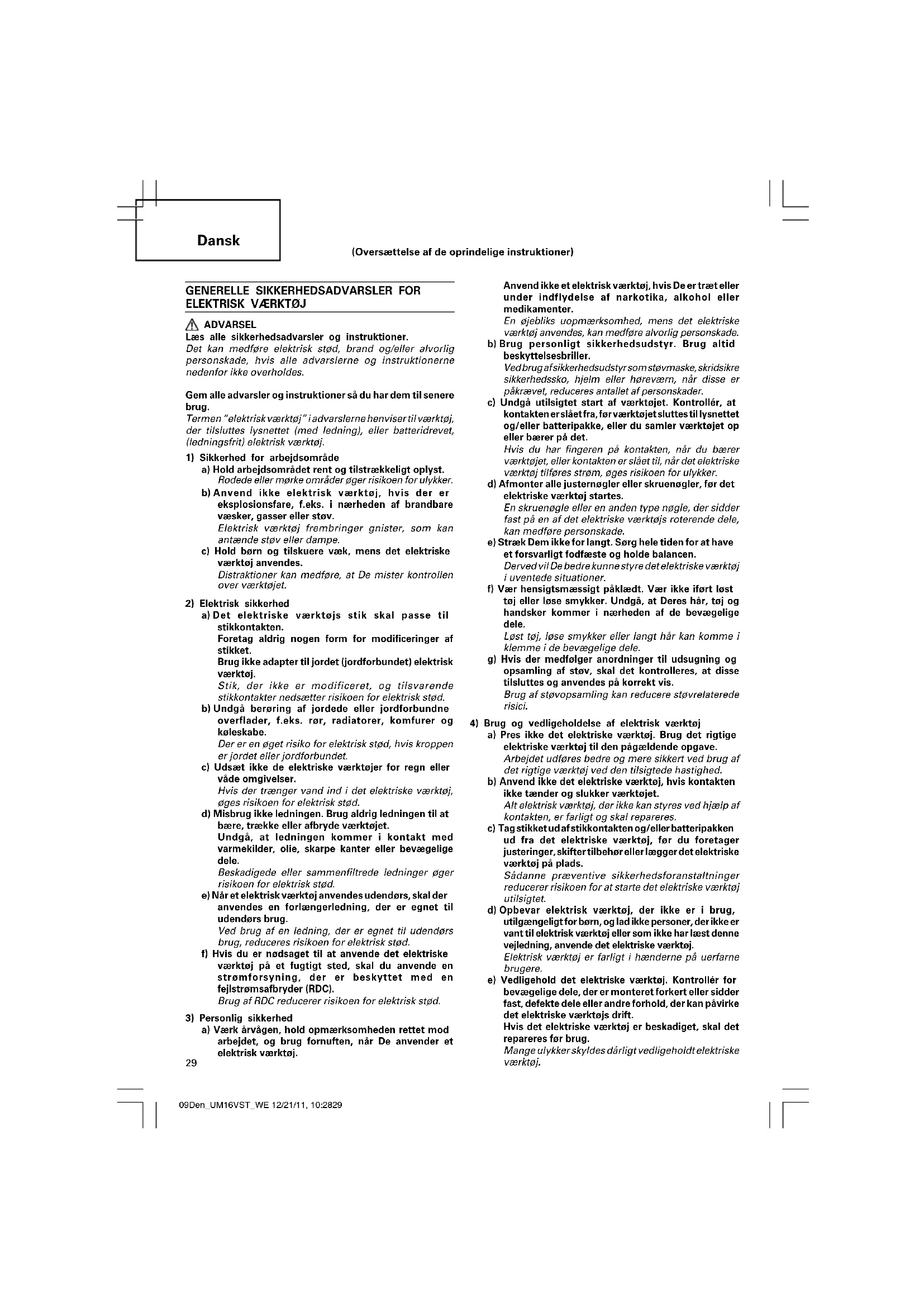 a) Værk årvågen, hold opmærksomheden rettet mod arbejdet, og brug fornuften, når De anvender et elektrisk værktøj. (Oversættelse af de oprindelige instruktioner) 09Den_UM16VST_WE 12/21/11, 10:2829Dansk