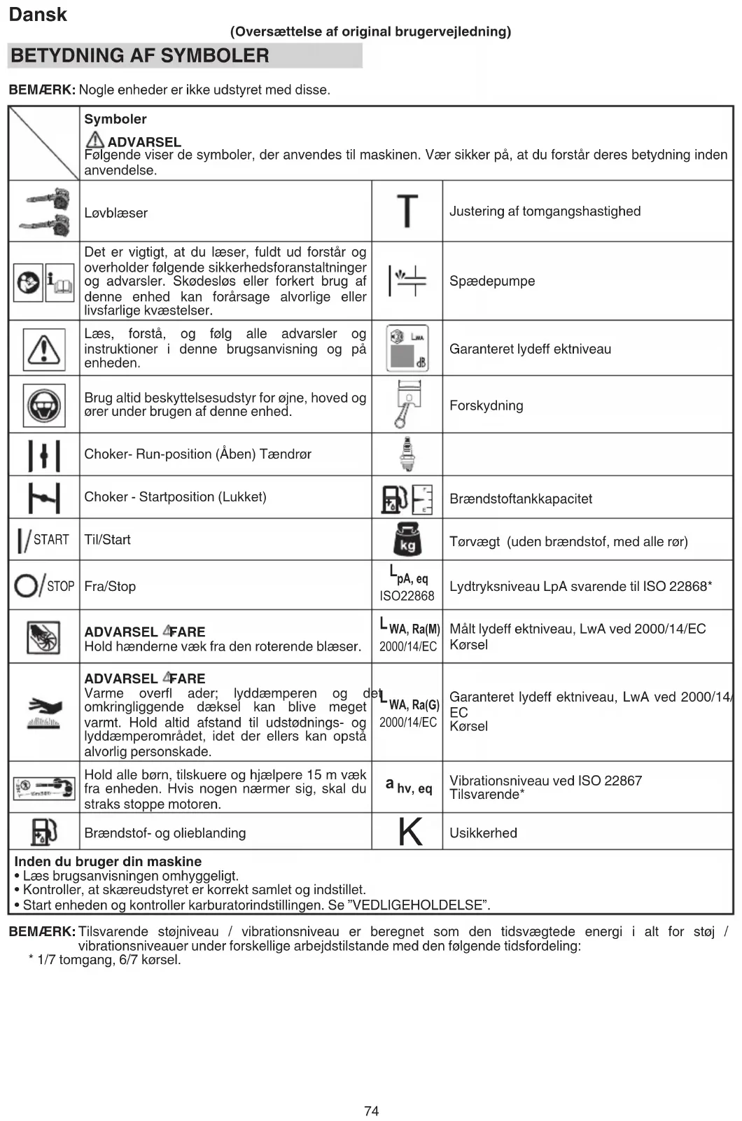 BEMÆRK: Nogle enheder er ikke udstyret med disse. Symboler ADVARSEL Følgende viser de symboler, der anvendes til maskinen. Vær sikker på, at du forstår deres betydning inden anvendelse. Løvblæser Justering af tomgangshastighed Det er vigtigt, at du læser, fuldt ud forstår og overholder følgende sikkerhedsforanstaltninger og advarsler. Skødesløs eller forkert brug af denne enhed kan forårsage alvorlige eller livsfarlige kvæstelser. Spædepumpe Læs, forstå, og følg alle advarsler og instruktioner i denne brugsanvisning og på enheden. Garanteret lydeff ektniveau Brug altid beskyttelsesudstyr for øjne, hoved og ører under brugen af denne enhed. Forskydning Choker- Run-position (Åben) Tændrør Choker - Startposition (Lukket) Brændstoftankkapacitet START Til/Start Tørvægt (uden brændstof, med alle rør) STOP Fra/Stop