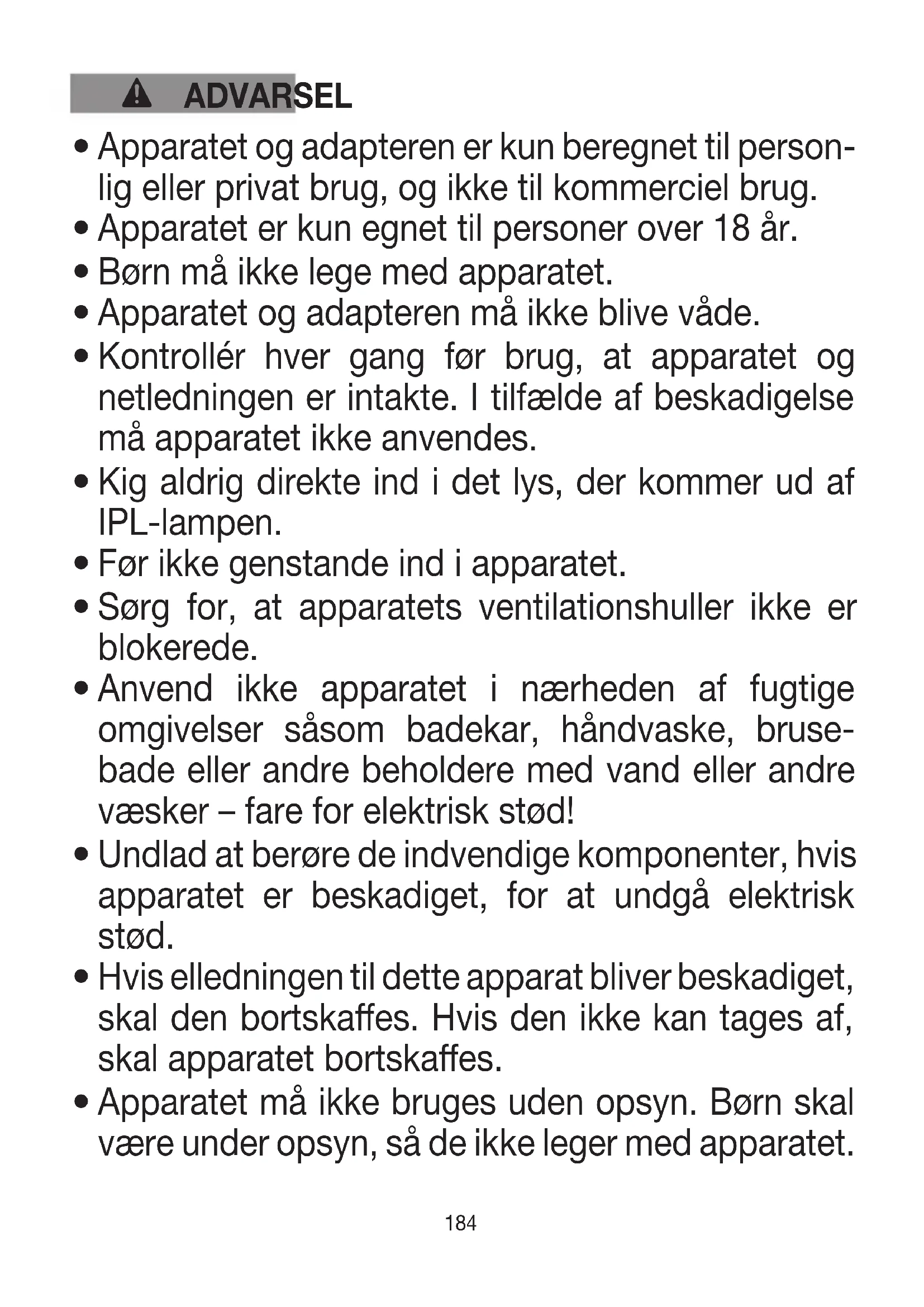Apparatet må ikke bruges uden opsyn. Børn skal være under opsyn, så de ikke leger med apparatet.185