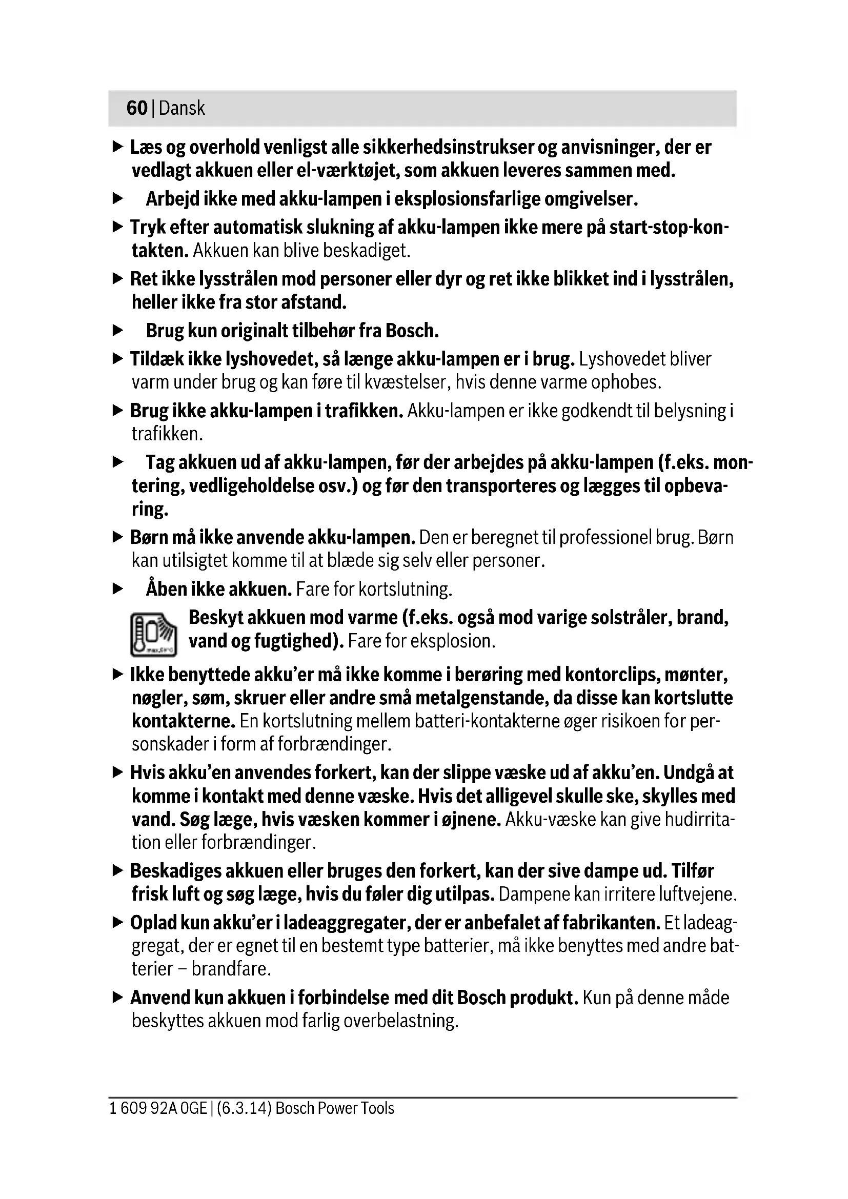 - begrænset effekt ved temperaturer <0 °C OBJ_BUCH-2104-002.book Page 62 Thursday, March 6, 2014 1:22 PMDansk | 63 Bosch Power Tools 1 609 92A 0GE | (6.3.14) Brug Ibrugtagning Isæt akku Sæt det opladede batteri 2 i lampehovedet 1, indtil det går mærkbart i indgreb. Tænd/sluk Tryk til ibrugtagning af akku-lampen på start-stop-kontakten 9. Akku-lampen slukkes ved at trykke på start-stop-kontakten 9 en gang til. For at spare på energien bør du kun tænde for akku-lampen, når du bruger den. Lysstyrke indstilles Tryk kort på tænd/sluk-kontakten 9 for at aktivere den batteridrevne lampe med mak- simal lysstyrke. Hold tænd/sluk-kontakten inde i 2 trin 9, indtil den ønskede lysstyrke er opnået. Temperaturafhængig overbelastningsbeskyttelse Overskrides den tilladte køleelementtemperatur på 50 °C, slukker akku-lampen. Lad akku-lampen afkøle og tænd for akku-lampen igen. Arbejdsvejledning Den batteridrevne lampe lyser med reduceret lysstyrke, hvis batterikapaciteten sta- dig er ca. 1,3 %. Den batteridrevne lampe blinker 3x, før lysstyrken aftager. Drej lampehovedet (se Fig. A) Afhængigt af anvendelsen kan lampehovedet 1 drejes op til 200°. – Som uplight med lampehovedet rettet opad. – Drejet 90° lysende ind i rummet. – Med ca. 120° vinklet lampehoved kan arbejdspladsen eller skrivebordet oplyses uden blænding. – Med ca. 200° vinklet lampehoved kan gulvet oplyses. Bemærk: Ved en vinkling på mere end 90° skal lampehovedet fastgøres. Ophængningskrog (se Fig. B) Med ophængskroge 7 kan den batteridrevne lampe fastgøres på en genstand. Karabinhager (se Fig. C) Med karabinhagen 4 kan du f.eks. fastgøre den batteridrevne lampe på en wire eller i bæltet. OBJ_BUCH-2104-002.book Page 63 Thursday, March 6, 2014 1:22 PM64 | Dansk 1 609 92A 0GE | (6.3.14) Bosch Power Tools Fastgørelsesmagnet (se Fig. D) Med fastgørelsesmagneten 6 kan du montere den batteridrevne lampe på ferromag- netiske overflader. Gå i den forbindelse forsigtigt frem for at undgå ridser på sarte overflader. Stativholder (1/4") (se Fig. E) Med stativholderen 8 kan du skrue den batteridrevne lampe fast på et stativ. Vedligeholdelse og service Vedligeholdelse og rengøring Når akkuen ikke fungerer mere, bedes du kontakte et autoriseret serviceværksted for Bosch el-værktøj. Akku-lampen er vedligeholdelsesfri og består ikke af dele, der skal skiftes eller vedli- geholdes. Rengør kun kunststofskiven på akku-lampen med en tør, blød klud for at undgå beska- digelser. Anvend ikke rengørings- eller opløsningsmidler. Kundeservice og brugerrådgivning Kundeservice besvarer dine spørgsmål vedr. reparation og vedligeholdelse af dit pro- dukt samt reservedele. Eksplosionstegninger og informationer om reservedele findes også under: www.bosch-pt.com Bosch brugerrådgivningsteamet vil gerne hjælpe dig med at besvare spørgsmål vedr. vores produkter og deres tilbehør. Det 10-cifrede typenummer på akku-lampens typeskilt skal altid angives ved fore- spørgsler og bestilling af reservedele. Dansk Bosch Service Center Telegrafvej 3 2750 Ballerup På www.bosch-pt.dk kan der online bestilles reservedele eller oprettes en reparations ordre. Tlf. Service Center: 44898855 Fax: 44898755 E-Mail: vaerktoej@dk.bosch.com OBJ_BUCH-2104-002.book Page 64 Thursday, March 6, 2014 1:22 PMDansk | 65 Bosch Power Tools 1 609 92A 0GE | (6.3.14) Transport De indeholdte Li-Ion-akkuer overholder bestemmelserne om farligt gods. Akkuerne kan transporteres af brugeren på offentlig vej uden yderligere pålæg. Ved forsendelse gennem tredjemand (f.eks.: lufttransport eller spedition) skal særli- ge krav vedr. emballage og mærkning overholdes. Her skal man kontakte en faregods- ekspert, før forsendelsesstykket forberedes. Send kun akkuer, hvis huset er ubeskadiget. Tilklæb åbne kontakter og indpak akkuen på en sådan måde, at den ikke kan bevæge sig i emballagen. Følg venligst også eventuelle, videreførende, nationale forskrifter. Bortskaffelse Akku-lamper, akkuer, tilbehør og emballage skal genbruges på en miljøvenlig måde. Smid ikke akku-lamper og akkuer/batterier ud sammen med det almindelige hushold- ningsaffald! Gælder kun i EU-lande: Iht. det europæiske direktiv 2012/19/EU om affald af elektrisk og elektronisk udstyr skal ikke mere brugbare akku-lamper og iht. di- rektiv 2006/66/EF skal defekte eller udtjente akkuer/batterier samles separat og genbruges iht. gældende miljøforskrifter. Akkuer/batterier: Li-Ion: Læs og overhold henvisningerne i afsnit „Transport“, side 65. Ret til ændringer forbeholdes. OBJ_BUCH-2104-002.book Page 65 Thursday, March 6, 2014 1:22 PM
