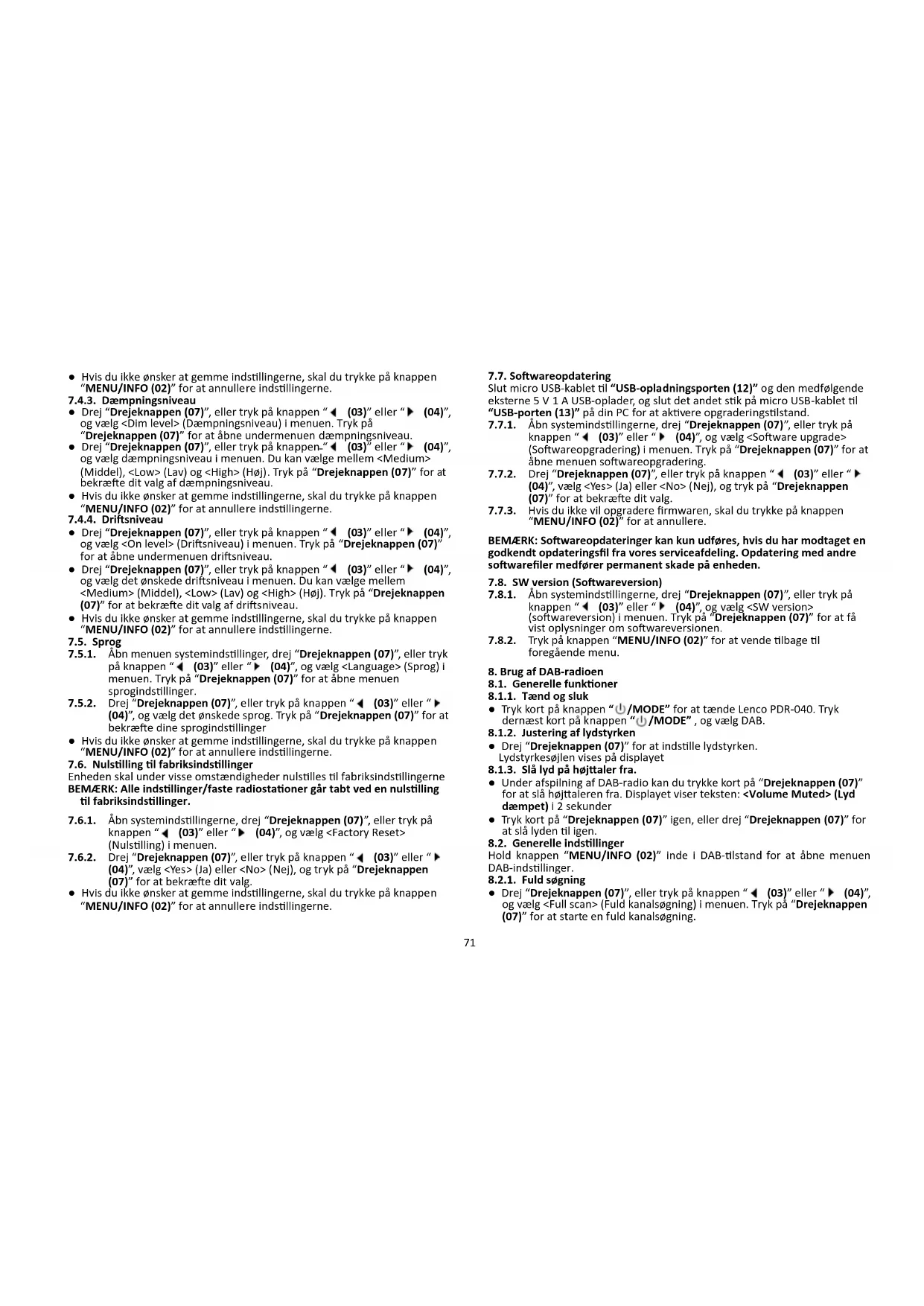 (04)”, og vælg det ønskede sprog. Tryk på “Drejeknappen (07)” for at bekræfte dine sprogindstillinger ● Hvis du ikke ønsker at gemme indstillingerne, skal du trykke på knappen “MENU/INFO (02)” for at annullere indstillingerne. 7.6. Nulstilling til fabriksindstillinger Enheden skal under visse omstændigheder nulstilles til fabriksindstillingerne BEMÆRK: Alle indstillinger/faste radiostationer går tabt ved en nulstilling til fabriksindstillinger.