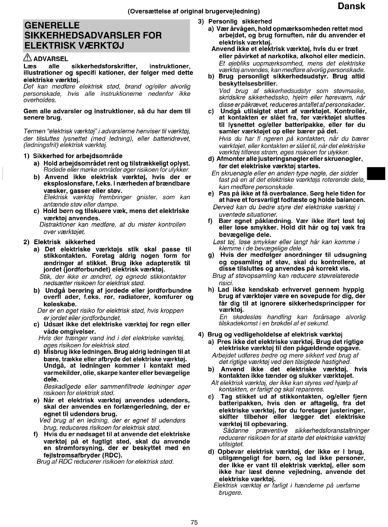 ADVARSEL Læs alle sikkerhedsforskrifter, instruktioner, illustrationer og specifi kationer, der følger med dette elektriske værktøj. Det kan medføre elektrisk stød, brand og/eller alvorlig personskade, hvis alle instruktionerne nedenfor ikke overholdes. Gem alle advarsler og instruktioner, så du har dem til senere brug. Termen “elektrisk værktøj” i advarslerne henviser til værktøj, der tilsluttes lysnettet (med ledning), eller batteridrevet, (ledningsfrit) elektrisk værktøj.