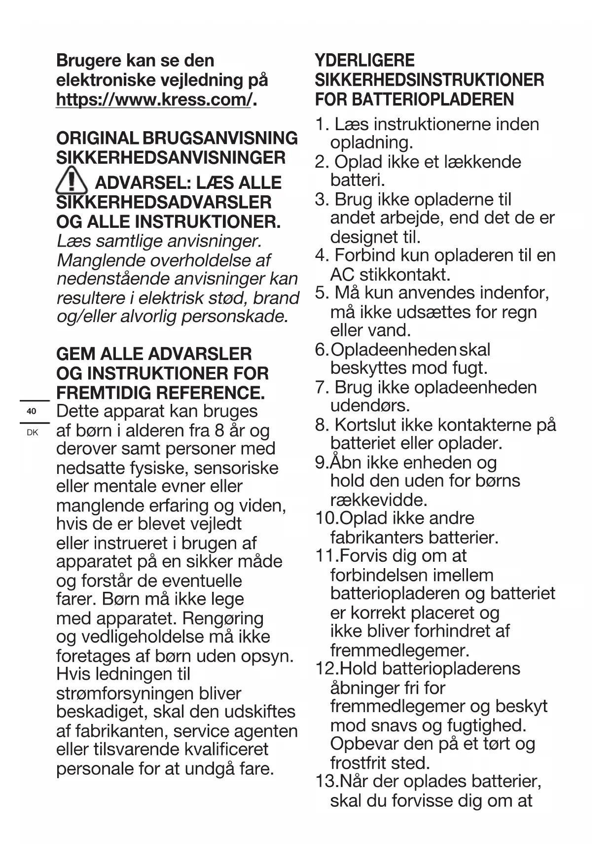 FREMTIDIG REFERENCE. Dette apparat kan bruges af børn i alderen fra 8 år og derover samt personer med nedsatte fysiske, sensoriske eller mentale evner eller manglende erfaring og viden, hvis de er blevet vejledt eller instrueret i brugen af apparatet på en sikker måde og forstår de eventuelle farer. Børn må ikke lege med apparatet. Rengøring og vedligeholdelse må ikke foretages af børn uden opsyn. Hvis ledningen til strømforsyningen bliver beskadiget, skal den udskiftes af fabrikanten, service agenten eller tilsvarende kvaliceret personale for at undgå fare. YDERLIGERE SIKKERHEDSINSTRUKTIONER FOR BATTERIOPLADEREN