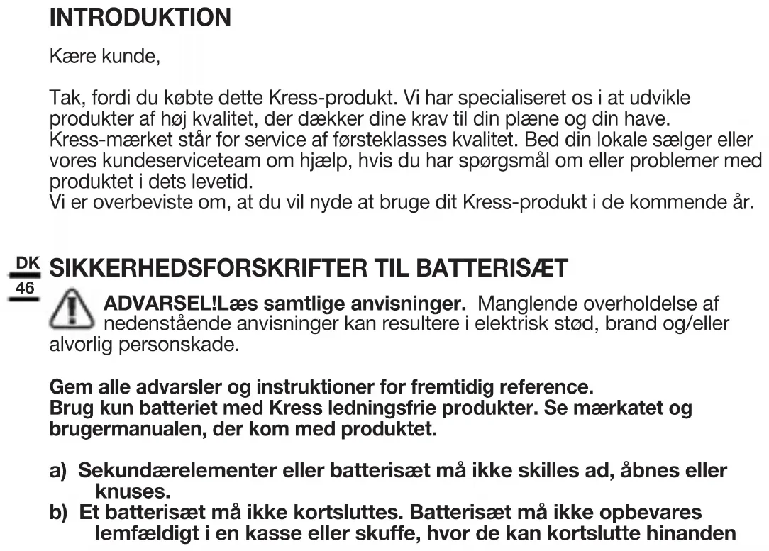 ADVARSEL!Læs samtlige anvisninger. Manglende overholdelse af nedenstående anvisninger kan resultere i elektrisk stød, brand og/eller alvorlig personskade. Gem alle advarsler og instruktioner for fremtidig reference. Brug kun batteriet med Kress ledningsfrie produkter. Se mærkatet og brugermanualen, der kom med produktet. a) Sekundærelementer eller batterisæt må ikke skilles ad, åbnes eller knuses. b) Et batterisæt må ikke kortsluttes. Batterisæt må ikke opbevares lemfældigt i en kasse eller skuffe, hvor de kan kortslutte hinanden47