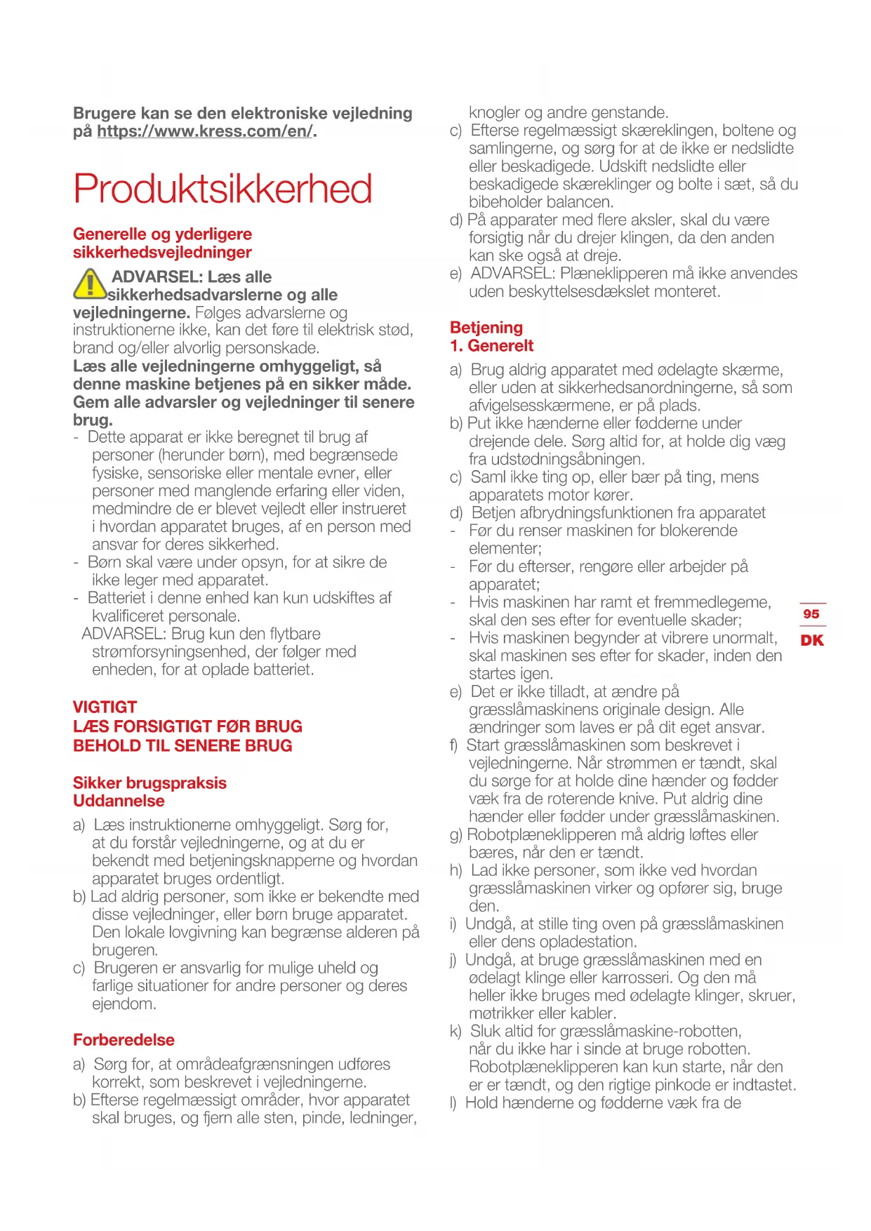 Brugere kan se den elektroniske vejledning på https://www.kress.com/en/. Produktsikkerhed Generelle og yderligere sikkerhedsvejledninger ADVARSEL: Læs alle sikkerhedsadvarslerne og alle vejledningerne. Følges advarslerne og instruktionerne ikke, kan det føre til elektrisk stød, brand og/eller alvorlig personskade. Læs alle vejledningerne omhyggeligt, så denne maskine betjenes på en sikker måde. Gem alle advarsler og vejledninger til senere brug. - Dette apparat er ikke beregnet til brug af personer (herunder børn), med begrænsede fysiske, sensoriske eller mentale evner, eller personer med manglende erfaring eller viden, medmindre de er blevet vejledt eller instrueret i hvordan apparatet bruges, af en person med ansvar for deres sikkerhed. - Børn skal være under opsyn, for at sikre de ikke leger med apparatet. - Batteriet i denne enhed kan kun udskiftes af kvalificeret personale. ADVARSEL: Brug kun den flytbare strømforsyningsenhed, der følger med enheden, for at oplade batteriet. VIGTIGT