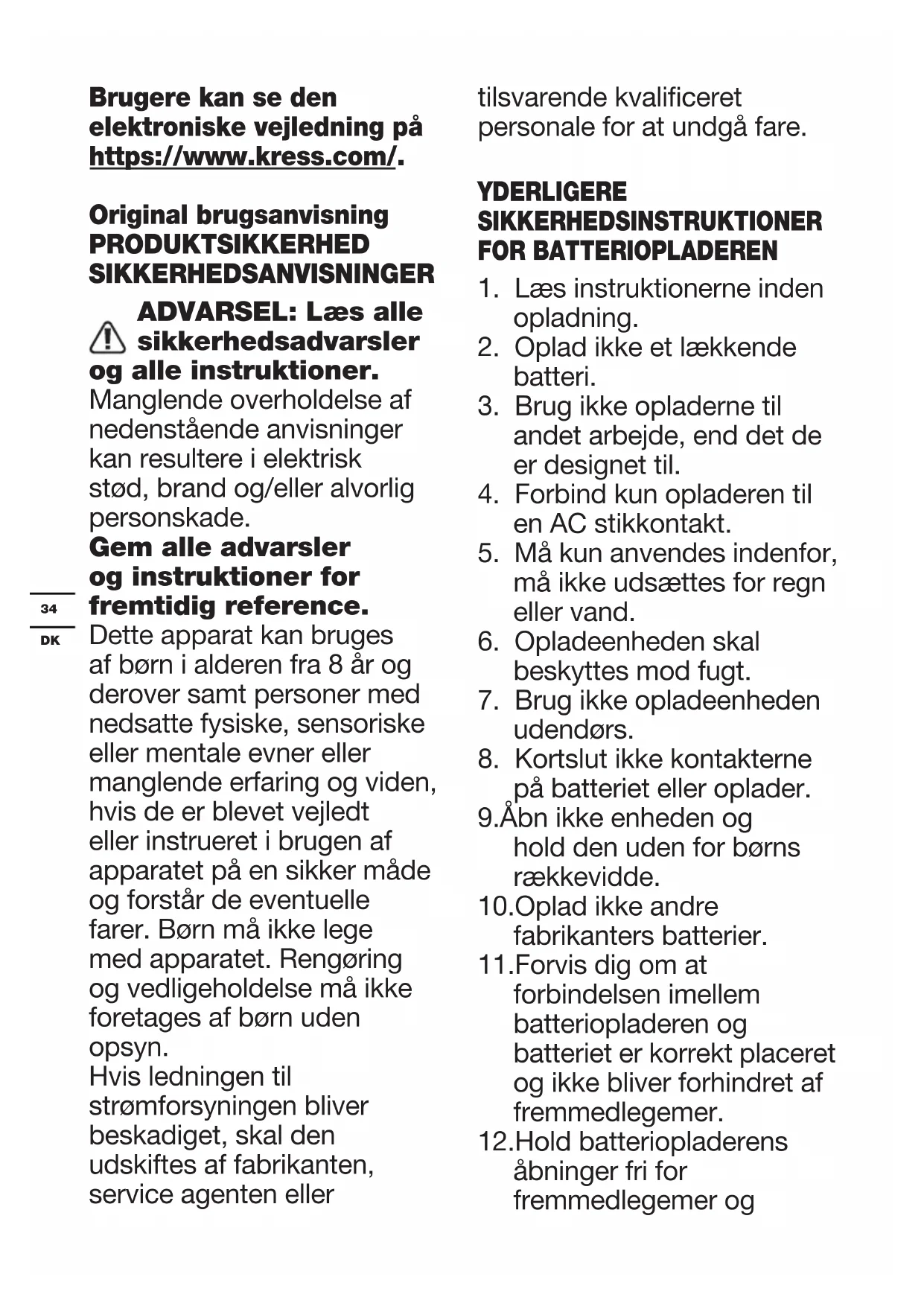 Brugere kan se den elektroniske vejledning på https://www.kress.com/. Original brugsanvisning PRODUKTSIKKERHED SIKKERHEDSANVISNINGER ADVARSEL: Læs alle sikkerhedsadvarsler og alle instruktioner. Manglende overholdelse af nedenstående anvisninger kan resultere i elektrisk stød, brand og/eller alvorlig personskade. Gem alle advarsler og instruktioner for fremtidig reference. Dette apparat kan bruges af børn i alderen fra 8 år og derover samt personer med nedsatte fysiske, sensoriske eller mentale evner eller manglende erfaring og viden, hvis de er blevet vejledt eller instrueret i brugen af apparatet på en sikker måde og forstår de eventuelle farer. Børn må ikke lege med apparatet. Rengøring og vedligeholdelse må ikke foretages af børn uden opsyn. Hvis ledningen til strømforsyningen bliver beskadiget, skal den udskiftes af fabrikanten, service agenten eller tilsvarende kvaliceret personale for at undgå fare. YDERLIGERE SIKKERHEDSINSTRUKTIONER FOR BATTERIOPLADEREN